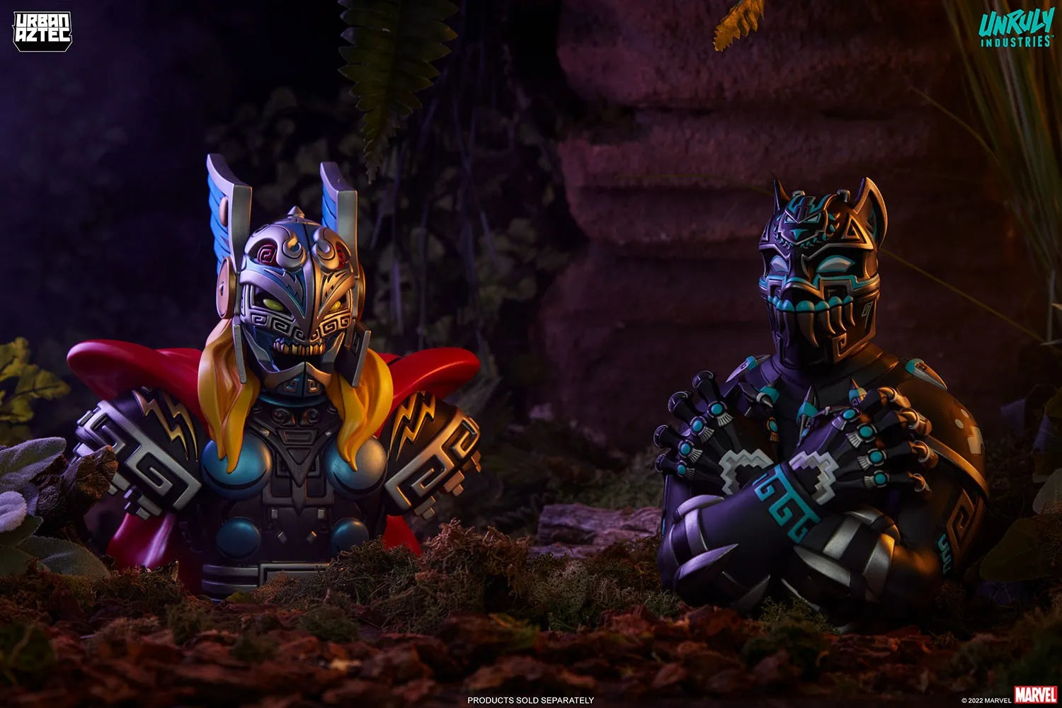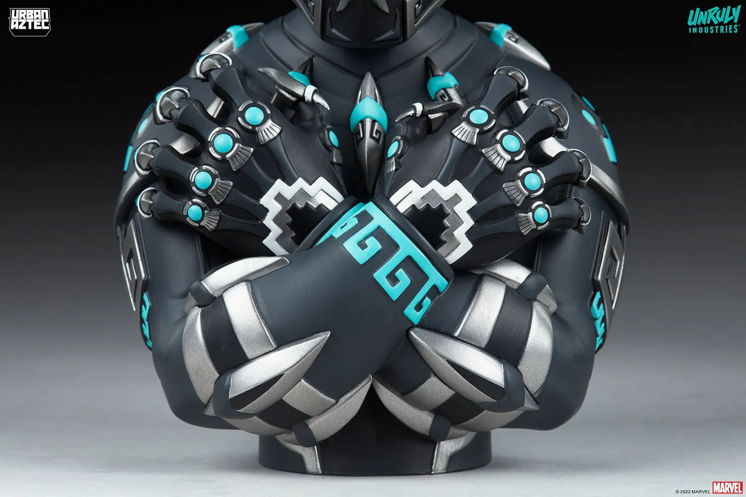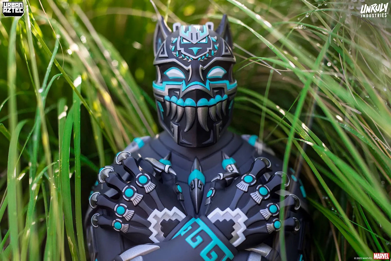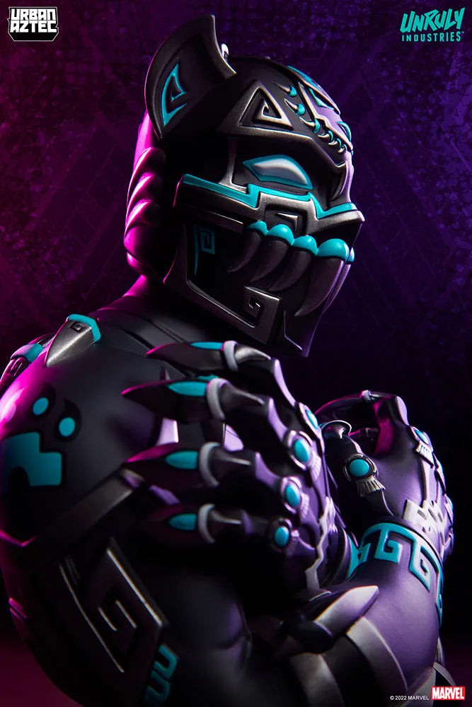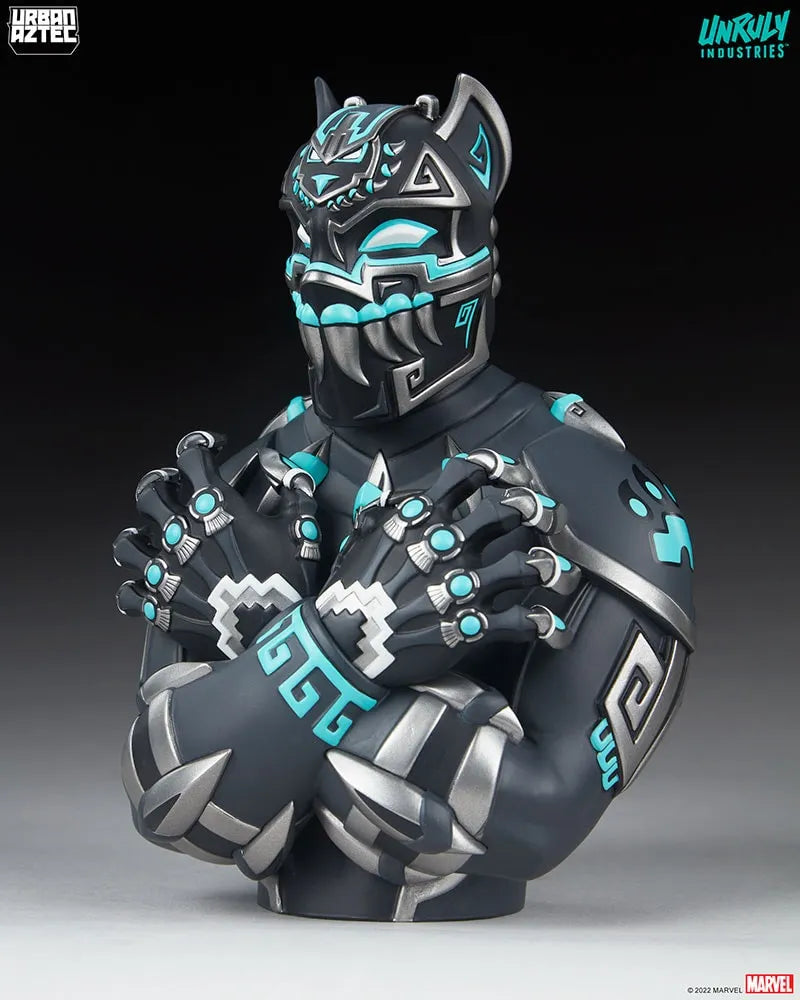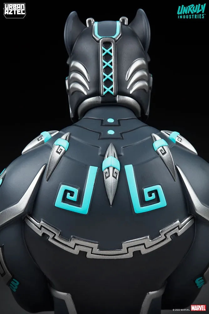 A força de duas culturas guerreiras se combina no busto colecionável de vinil do Pantera Negra, reativo à luz negra, criado pelo artista Jesse Hernandez. T’Challa exibe suas garras em uma saudação Wakandana, vestindo seu traje característico de Vibranium com influências do design Urban Aztec.