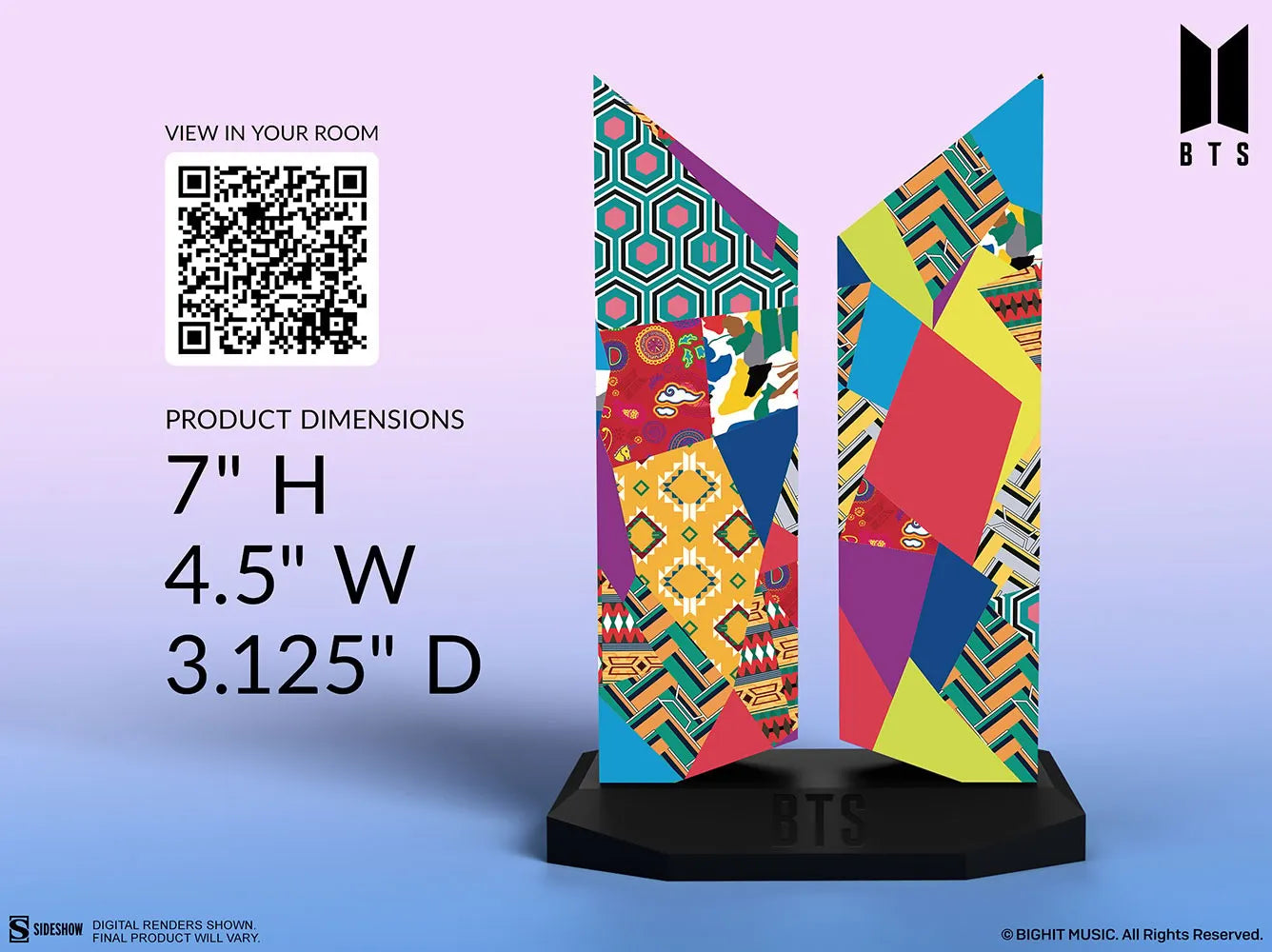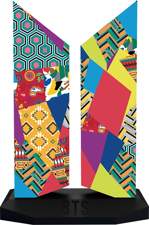 Sete seções vibrantes, multicoloridas e geométricas — incluindo pequenos arranjos repetidos do símbolo do BTS — explodem em ondas caleidoscópicas pela estátua. Essas partes detalhadas e decorativas se encontram com manchas sólidas e brilhantes de vermelho, amarelo, verde, azul e roxo para criar um padrão animado e único.