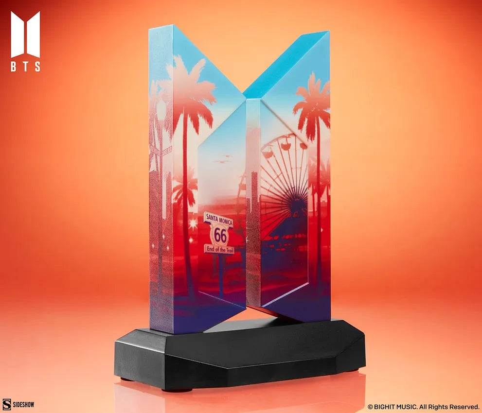 Medindo 17,8 cm de altura e 11,4 cm de largura, o Logo Premium do BTS: Edição Los Angeles adota a forma icônica do logo dos ícones pop do século 21, visualizado como um conjunto de portas se abrindo para possibilidades, e incorpora imagens quentes e vibrantes que são a cara de Los Angeles. De um lado da estátua está o símbolo do ARMY, logo atrás do logo do BTS, que une passado e presente em um design elegante.