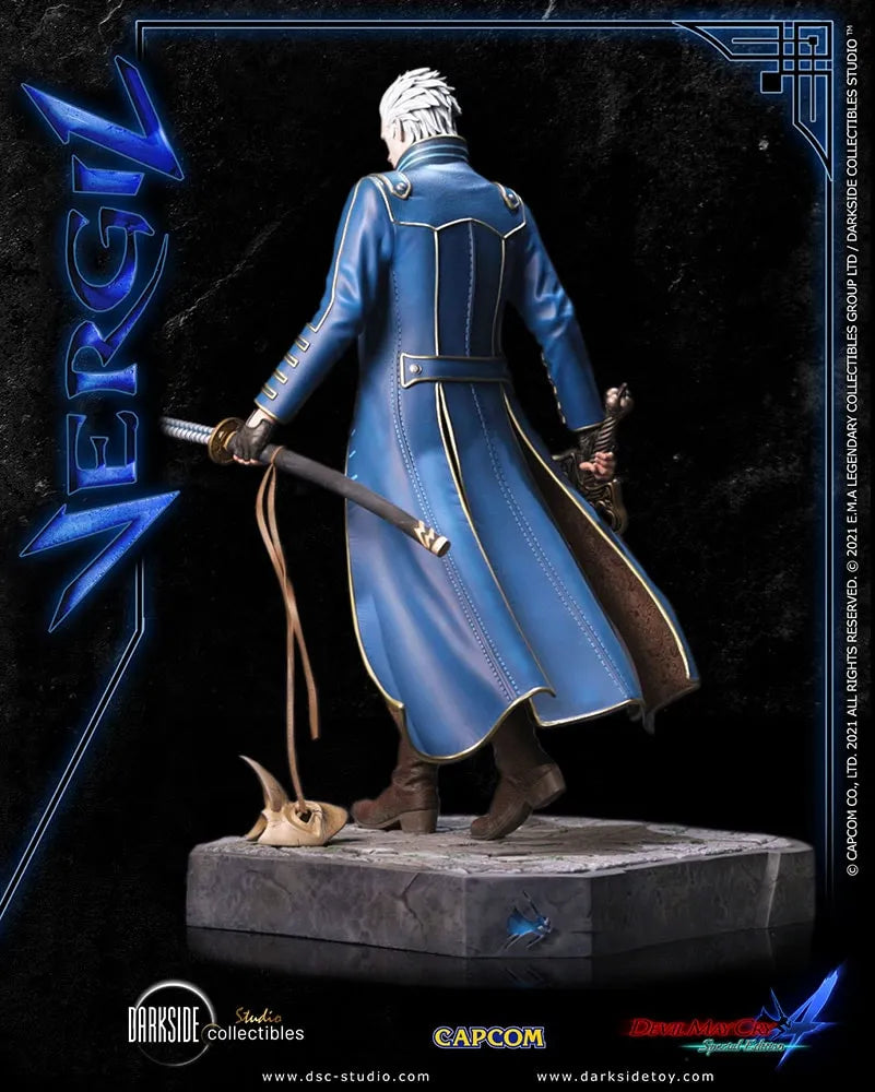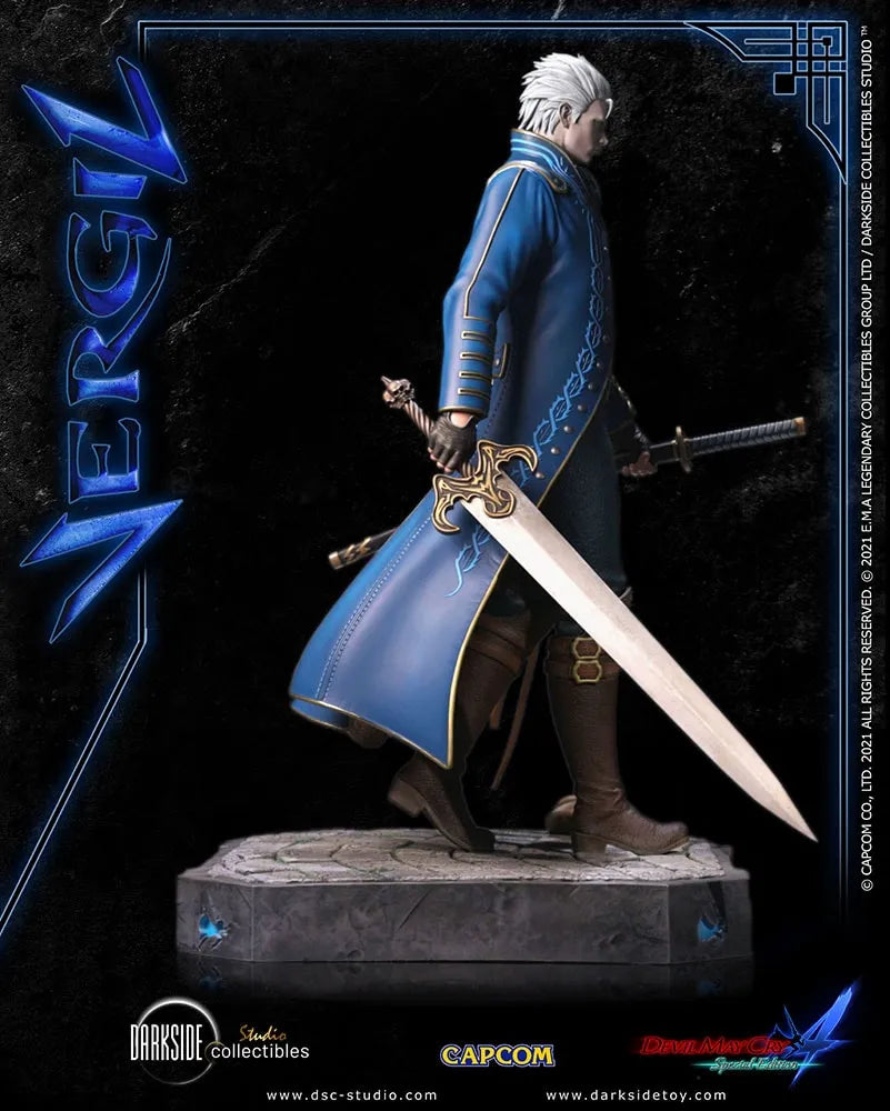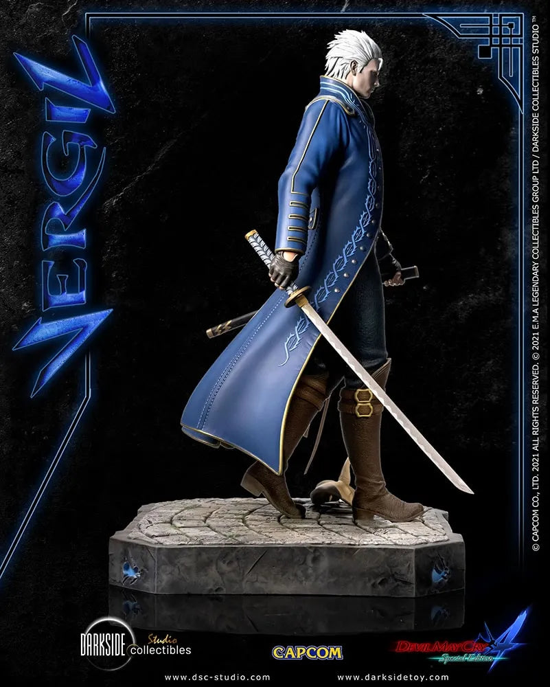Apresentado com um olhar desafiador, Vergil se ergue segurando sua arma de escolha, Yamato. Esta katana vem com uma opção de exibição secundária, permitindo que Vergil segure a Yamato embainhada em uma mão enquanto brandindo a Force Edge na outra. Esta é a segunda estátua da Série Devil May Cry do Darkside Collectibles. Seu acabamento espetacular pode ser visto de qualquer ângulo e é o centro de atenção definitivo para o fã mais dedicado de Devil May Cry.