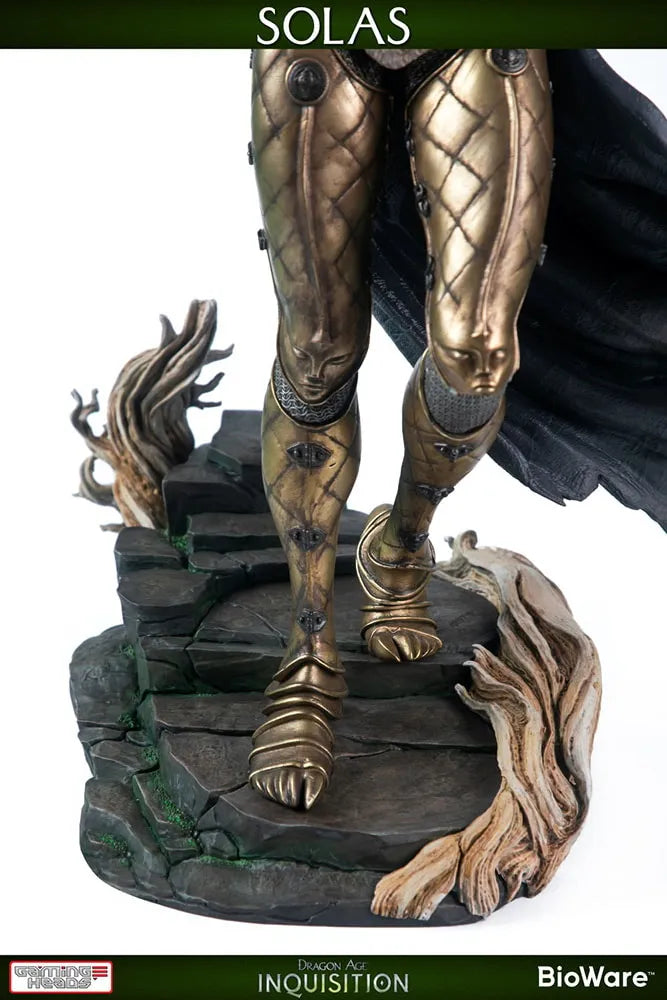 As Dragon Age™: Inquisition - Estátua de Solas mostra Solas em sua armadura do jogo descendo degraus de pedra cobertos de musgo, em profunda reflexão, com as mãos cruzadas atrás das costas. A estátua de Solas foi feita em escala 1:4 e tem cerca de 51 cm de altura (incluindo a base).