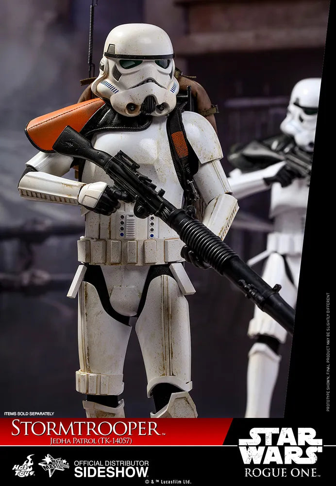 A figura colecionável altamente precisa é especialmente elaborada com base na imagem de um Stormtrooper especial com equipamento único patrulhando as ruas do planeta Jedha em Rogue One: Uma História Star Wars. Apresentando o capacete e a armadura de Stormtrooper completamente novos com efeitos de desgaste, um traje de tecido recém-desenvolvido, uma mochila totalmente nova e meticulosamente projetada, uma ombreira laranja, arma e acessórios detalhados, e um suporte de figura especialmente desenhado!