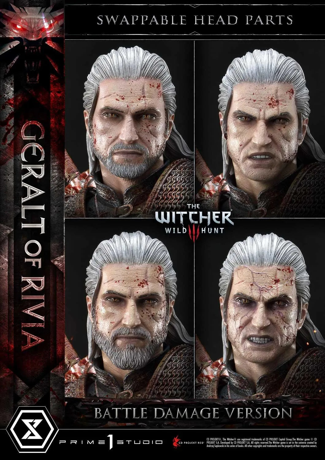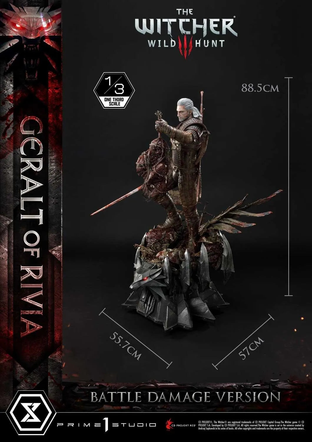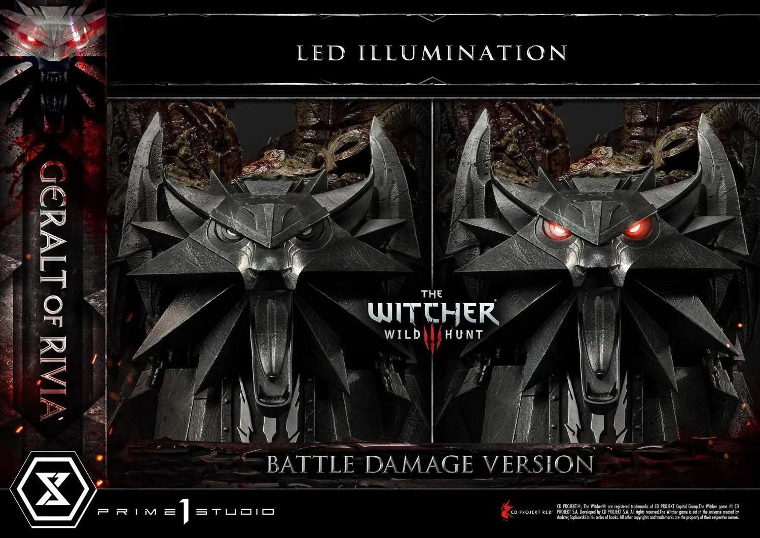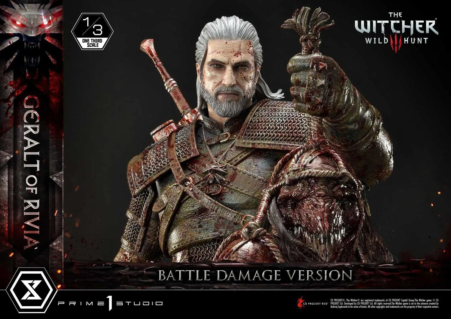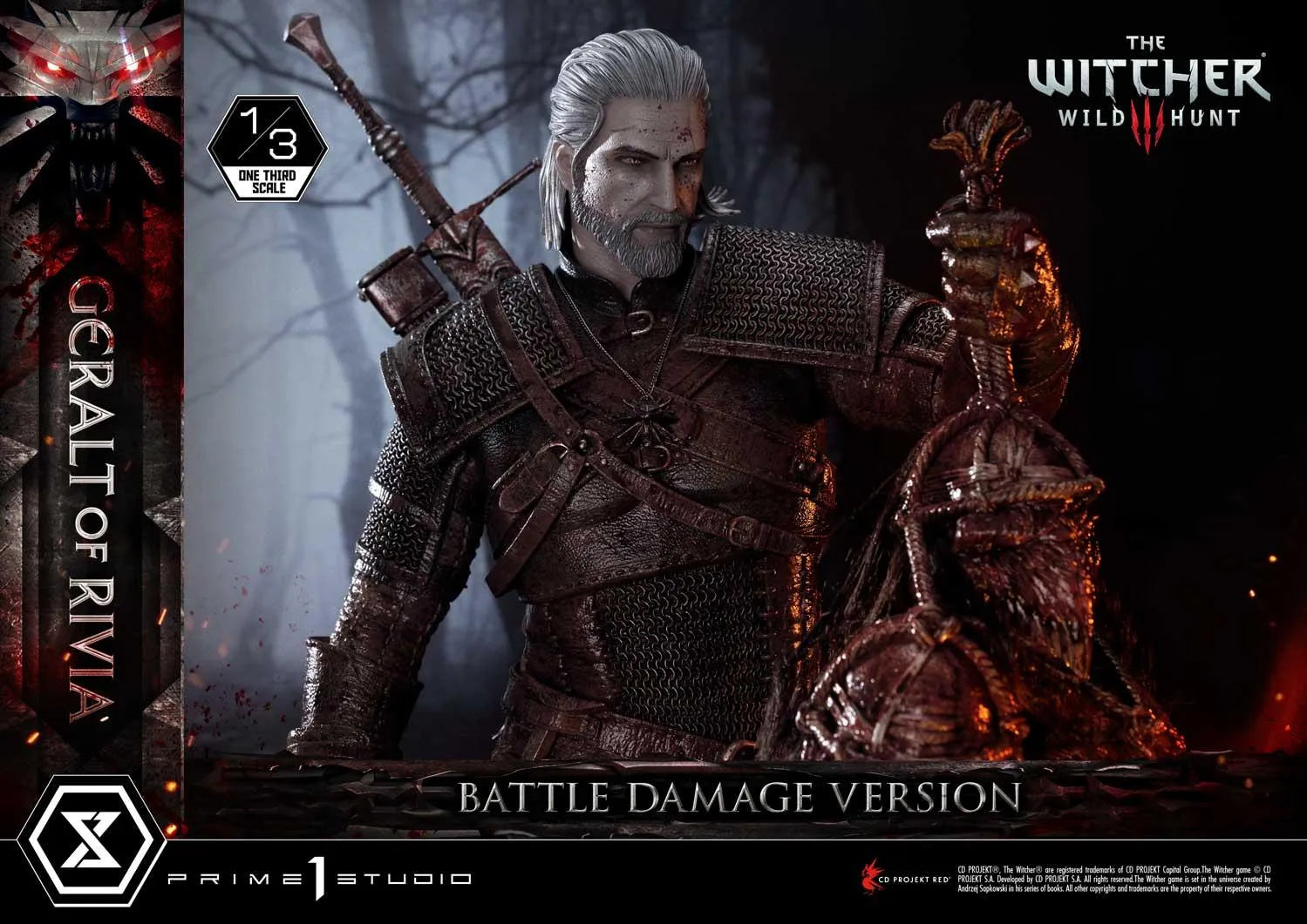 Nossos meticulosos A Prime 1 Studio artesãos tiveram grande cuidado e paciência ao aplicar uma quantidade convincente de sangue na armadura de Kaer Morhen de Geralt, em sua espada de prata Zireal, em seus troféus e no próprio Lobo Branco. Mais uma vez, nossos mestres pintores foram habilidosos na aplicação dos efeitos de gore para complementar a estátua existente.