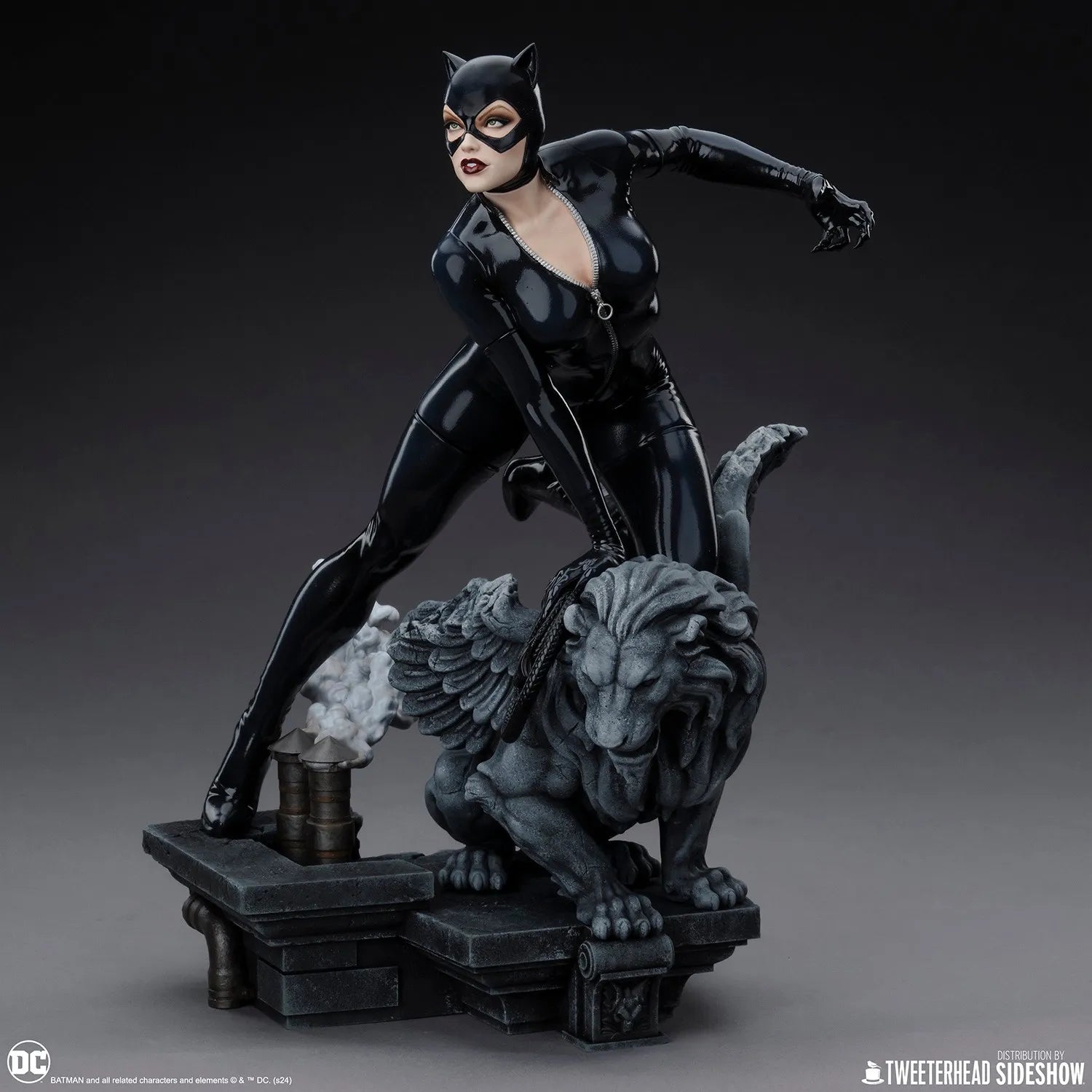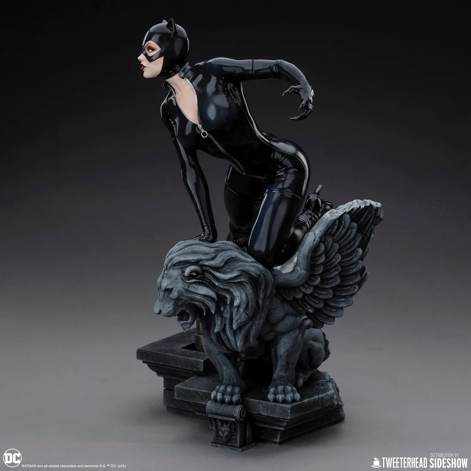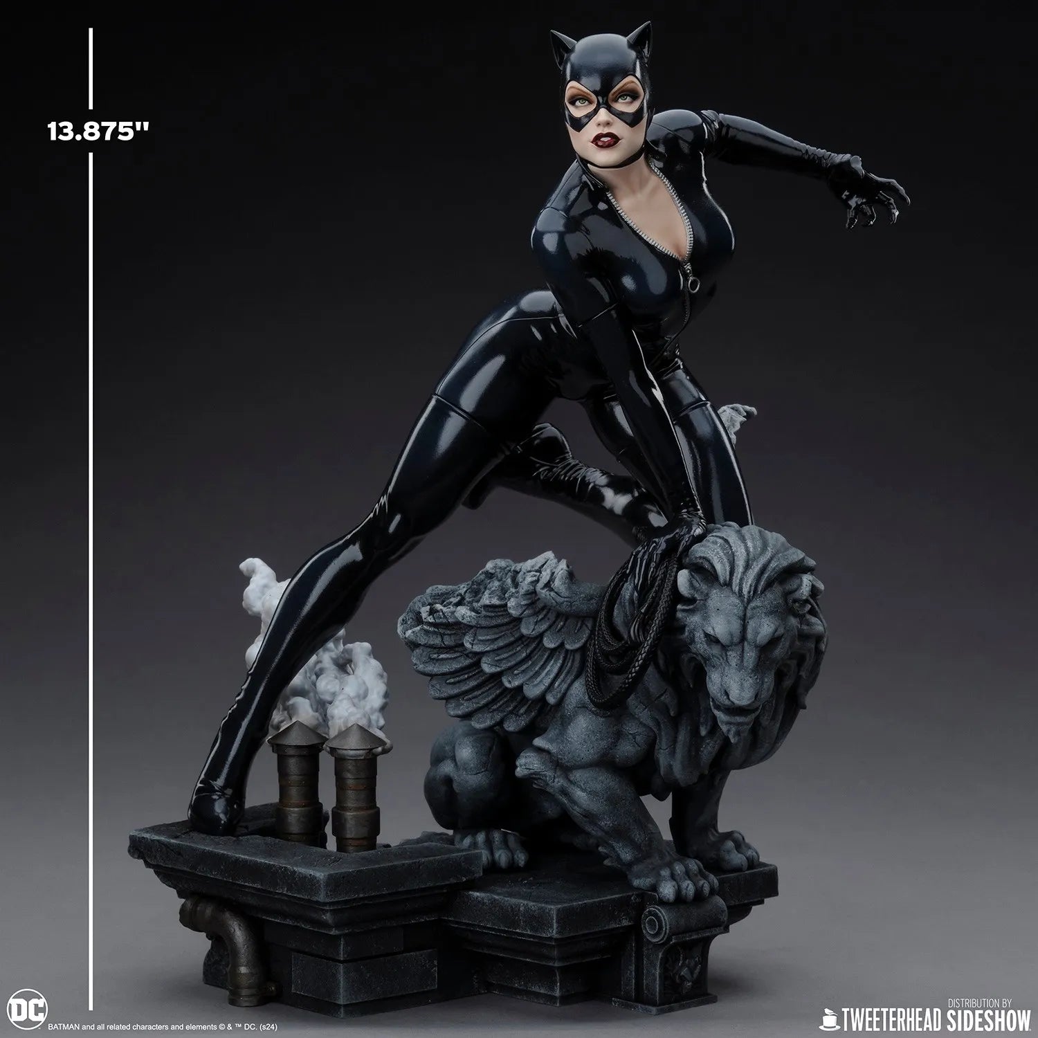 Esta estátua totalmente esculpida em poliresina traz a Mulher-Gato em uma versão "Neo Clássica" de seu traje, sobre um telhado estilo leão pronta para atacar! Dinamicamente posicionada com as garras à mostra e o chicote na mão, esta Mulher-Gato está pronta para se esgueirar para dentro da sua coleção!