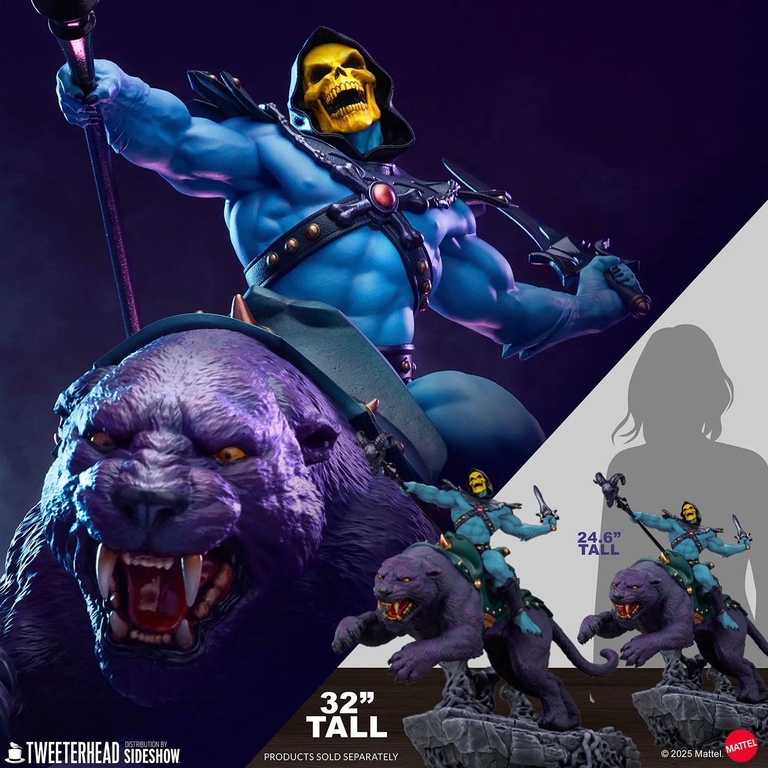 Esta maquete totalmente esculpida em poliresina vem com Skeletor montado em um Panthor selado, saltando da icônica rampa esquelética do Castelo de Grayskull, avançando para a batalha! Esta dupla é esculpida com detalhes intrincados que homenageiam todas as interpretações clássicas e vintage da dupla, oferecendo aos fãs a maquete definitiva de Skeletor & Panthor que eles estavam esperando, que combina perfeitamente com a Maquete em Escala 1/4 de He-Man™ & Gato Guerreiro™.