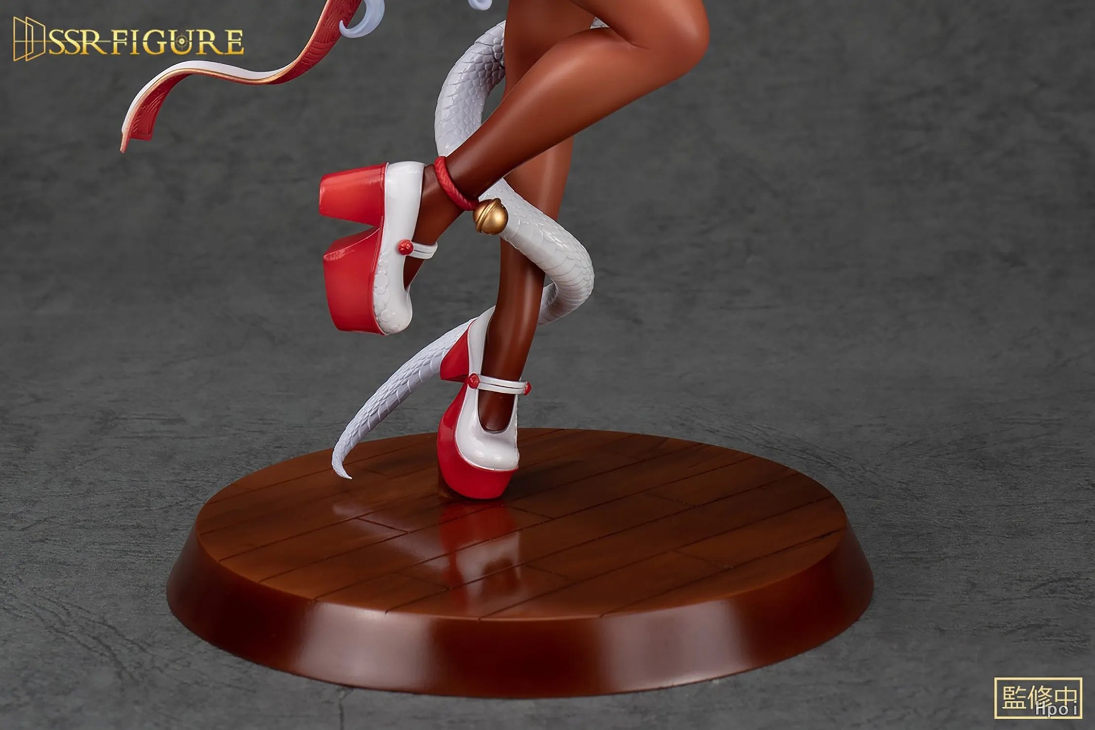 O formato geral é leve e dinâmico, e o design requintado do traje destaca a postura carismática da personagem. O contraste entre seu cabelo branco e pupilas vermelhas é cheio de mistério. A cobra branca se enrola ao redor da personagem de forma elegante, e a textura do corpo da cobra é clara e realista. Os seis sinos são feitos de metal e tocam suavemente durante os movimentos.