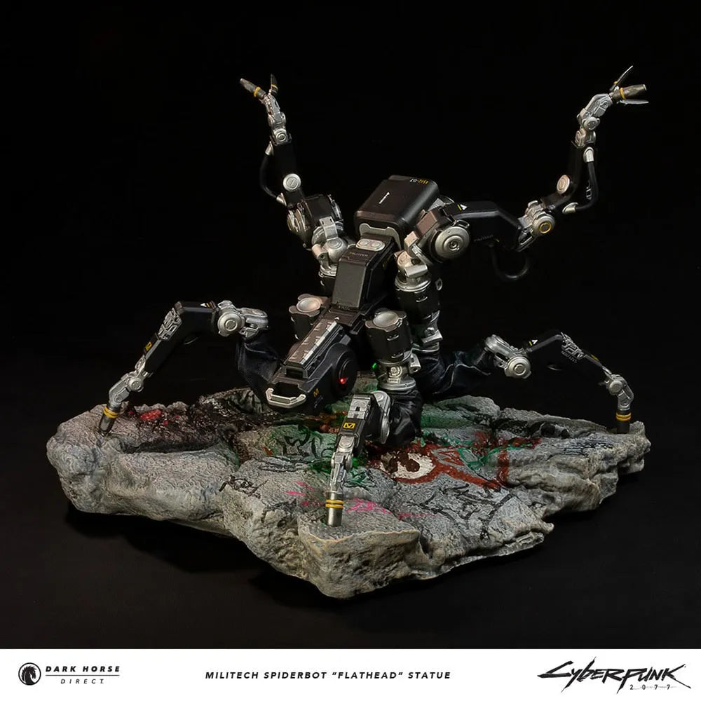 Baseada no modelo de ponta Militech MT0D12 “Flathead”, esta réplica de primeira linha está pronta para missões de furtividade e reconhecimento. Possui diodos emissores de luz (LEDs) funcionais, incluindo luzes indicadoras de ambiente verde e ativação vermelha. Posicionado sobre concreto marcado pelo Maelstrom das ruas de Night City, o Spiderbot “Flathead” está em posição de atenção com 27,3 cm de largura por 25,4 cm de altura.