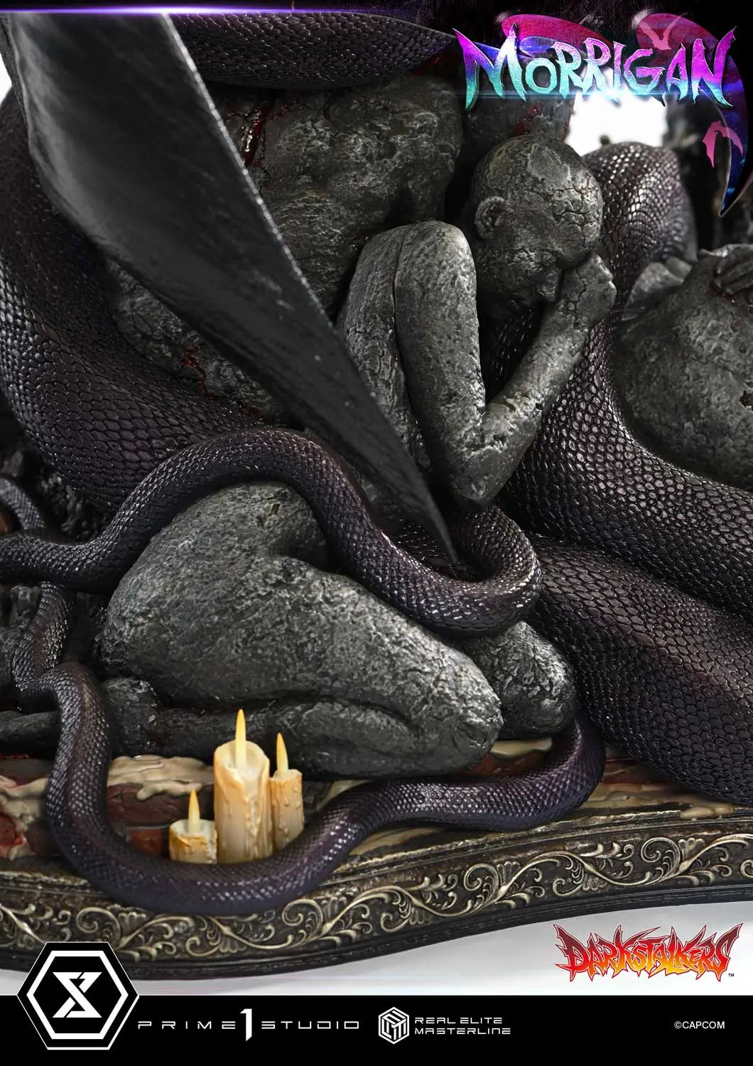 A base gótica personalizada apresenta uma serpente enrolada erguendo sua cabeça e seres petrificados reduzidos a uma imagem de trono que evoca o poder e a sedução de Morrigan. Mesmo em pedra, o sangue continua a fluir, um símbolo de prazer e dor infinitos.