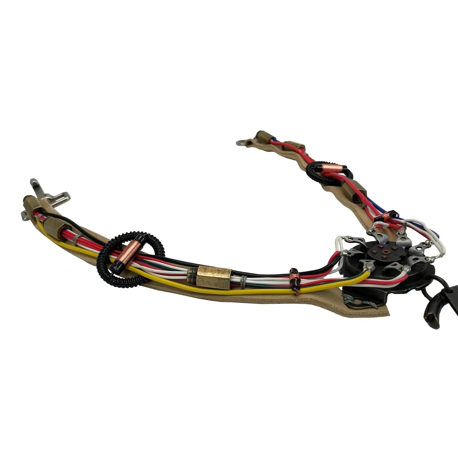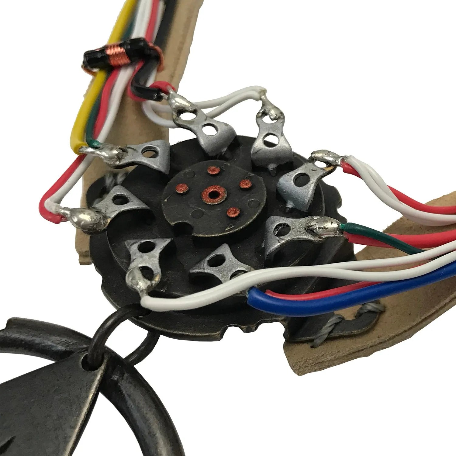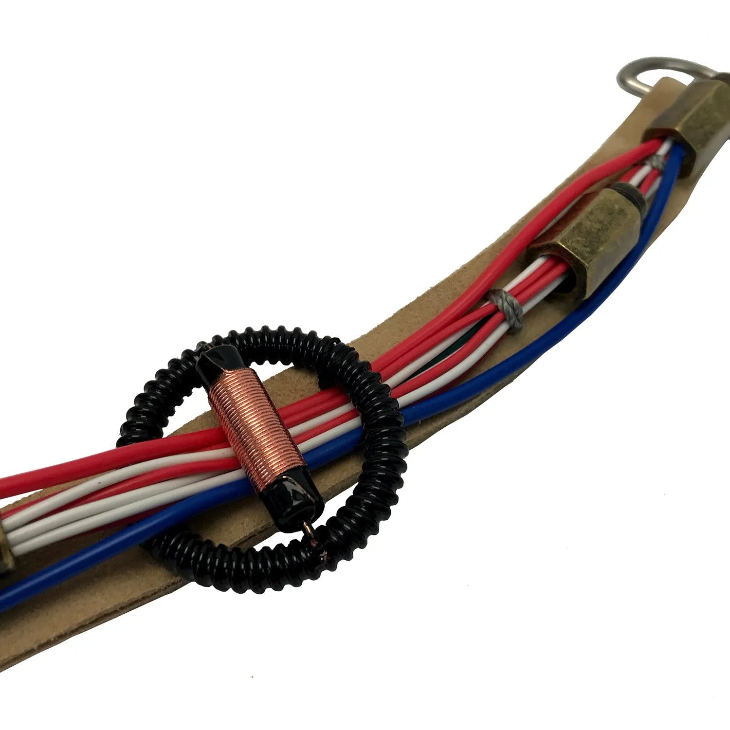 Devido à raridade e, em alguns casos, à fragilidade dos componentes elétricos vintage reais, essas partes foram recriadas em metal sólido. Cada réplica apresenta fio elétrico real da bitola e cor corretas. Todas as partes foram então costuradas à mão em uma faixa de camurça sintética, exatamente como os adereços originais.