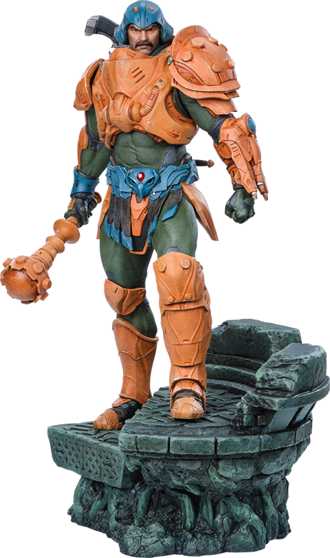 Esta estátua totalmente esculpida em poliresina traz o Man-At-Arms reimaginado com um visual altamente detalhado e moderno, mas fiel ao seu traje, mesclando elementos de suas encarnações clássica e moderna, enquanto traz algo único para ele se encaixar na linha "Legends". Ele vem equipado com armas como seu clássico Mace, Arm Blaster, além de uma Pistola e uma Faca nas costas. Em pé no topo de uma das torres mais altas do Castelo de Grayskull, esta peça é temática para exibir perfeitamente com seus outros Guerreiros Heróicos na coleção, como a já lançada Feiticeira e Teela!