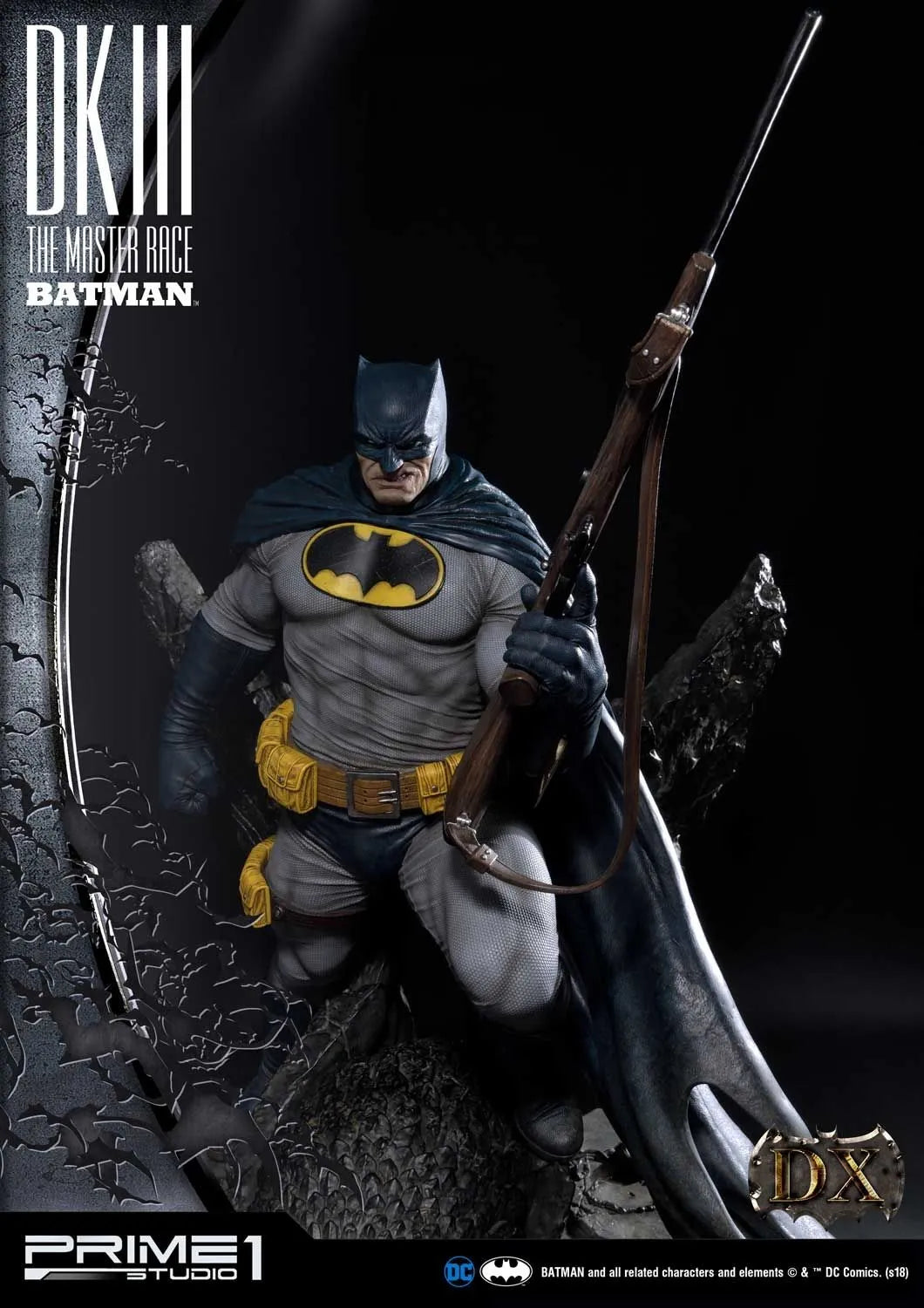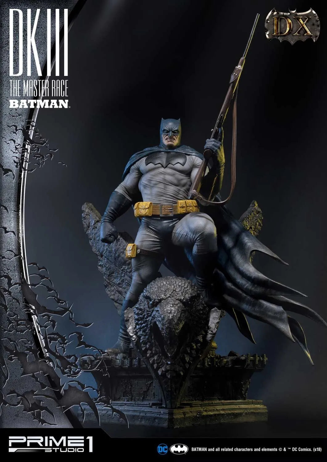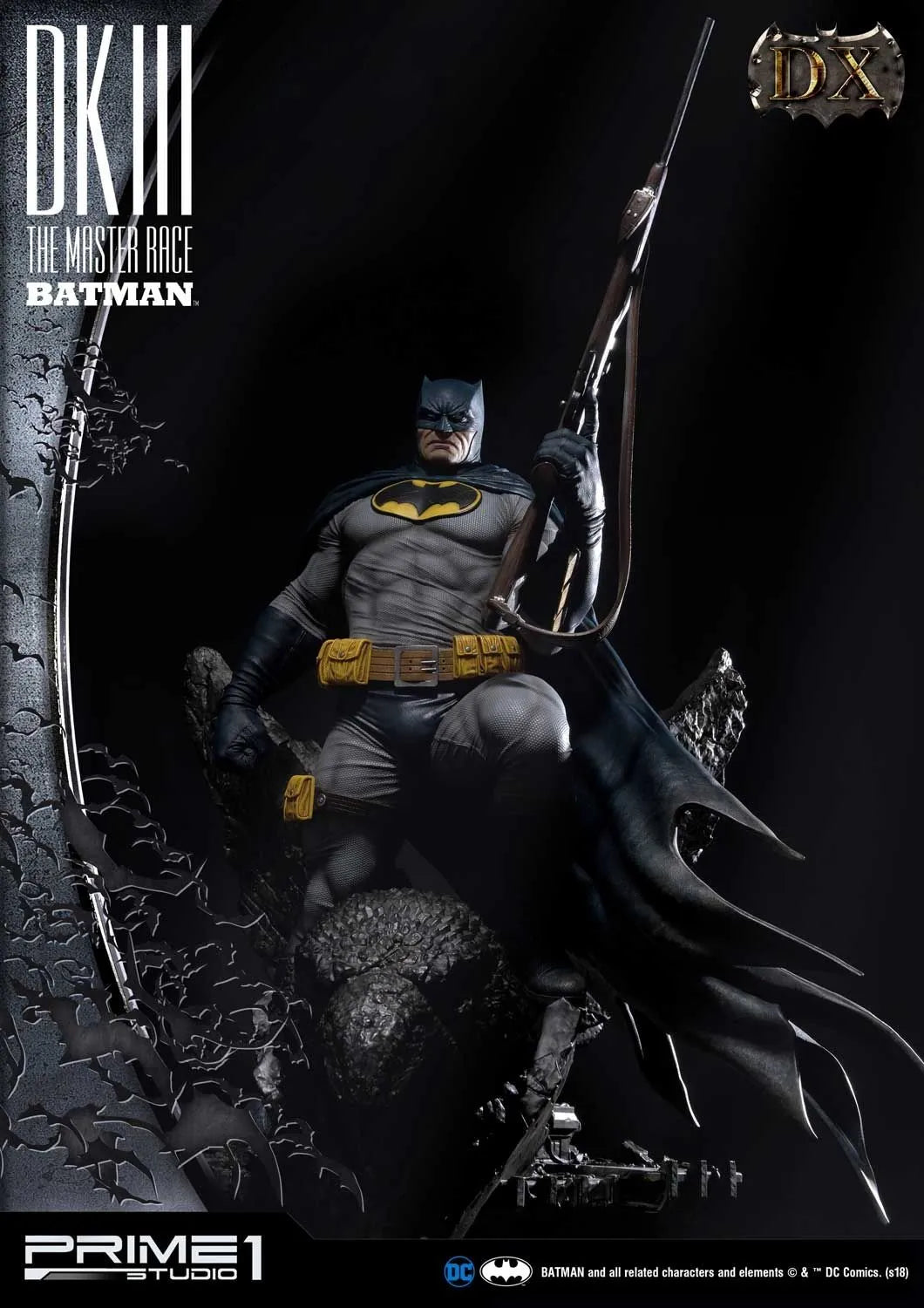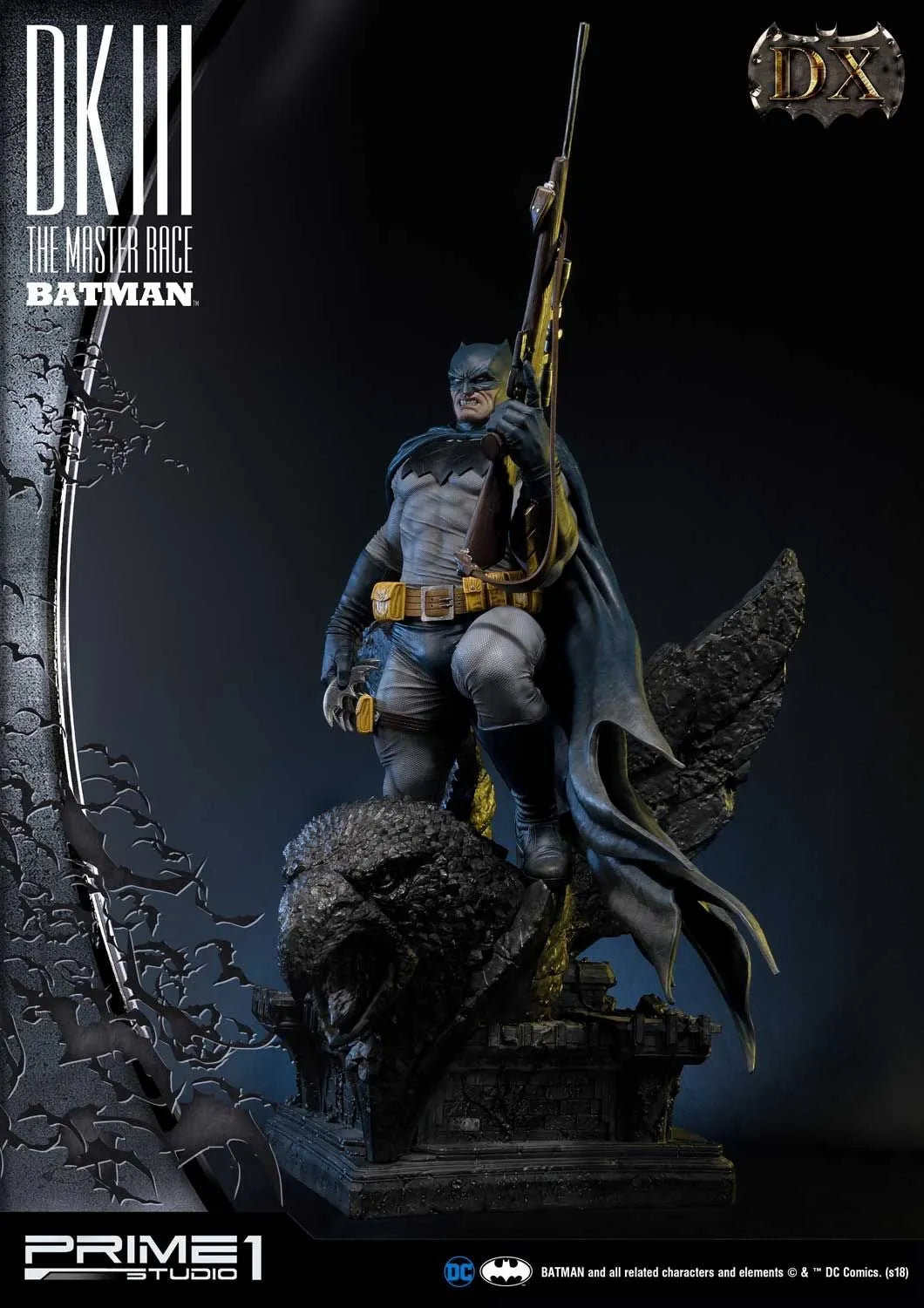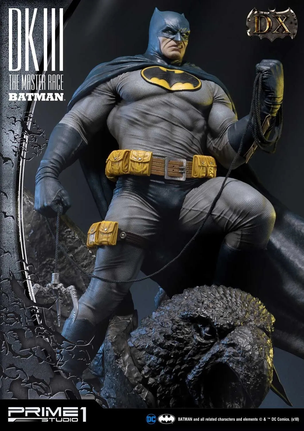 A Prime 1 Studio tem o orgulho de apresentar a MMDCDK3-01DX em escala 1/3: Versão Deluxe do Batman de The Dark Knight III: The Master Race. The Dark Knight III: The Master Race, também estilizado como DK III: The Master Race, é uma série limitada de nove edições da DC Comics co-escrita por Frank Miller e Brian Azzarello e ilustrada por Miller, Andy Kubert e Klaus Janson. Já se passaram 3 anos desde que Batman esteve ativo pela última vez. Nesse tempo, a maioria acredita que ele desapareceu ou morreu, rejeitando a ideia de que ele poderia voltar. Eles estavam errados. Uma foto do que parece ser o Batman é tirada, mostrando-o derrubando impiedosamente policiais que iam atirar em um garoto desarmado. A mídia, claro, explode, e tudo o que se fala é sobre o retorno do Batman. A série é uma sequência da minissérie do Batman de 1986 de Miller, continuando a história de um envelhecido Bruce Wayne retomando sua identidade como combatente do crime, auxiliado por sua ajudante Carrie Kelley (Robin) e apresentando um elenco de personagens do Universo DC, incluindo Superman, Lanterna Verde e Mulher Maravilha.