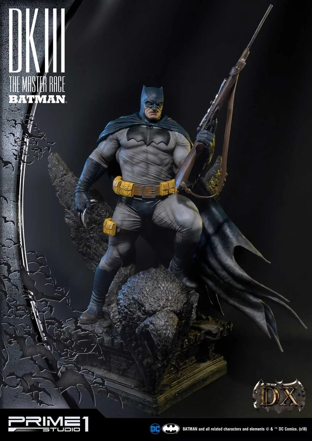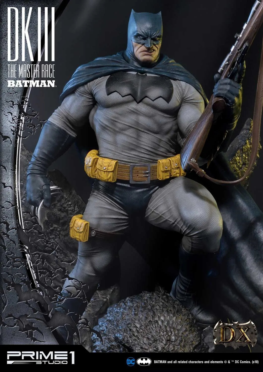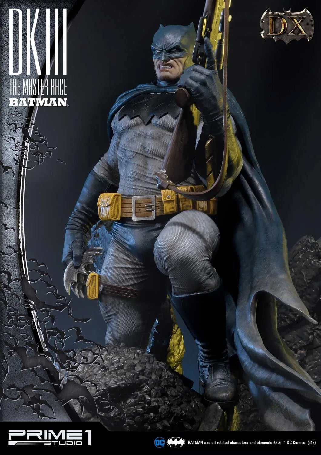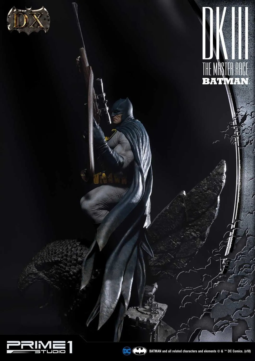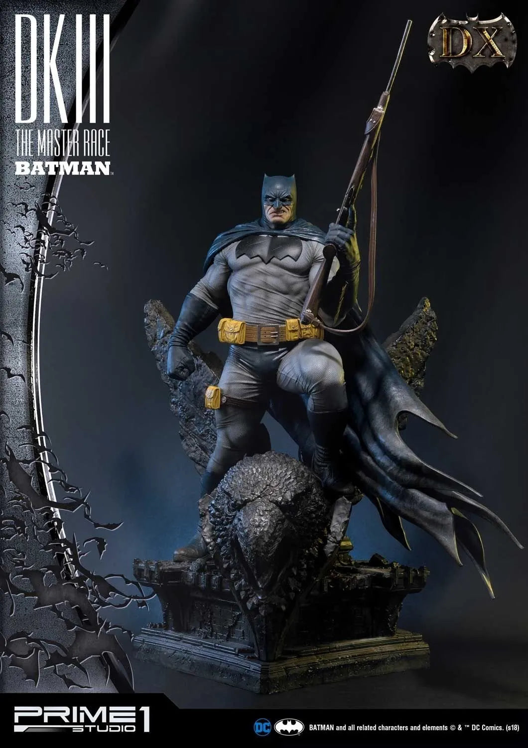 A Prime 1 Studio tem o orgulho de apresentar a MMDCDK3-01DX em escala 1/3: Versão Deluxe do Batman de The Dark Knight III: The Master Race. The Dark Knight III: The Master Race, também estilizado como DK III: The Master Race, é uma série limitada de nove edições da DC Comics co-escrita por Frank Miller e Brian Azzarello e ilustrada por Miller, Andy Kubert e Klaus Janson. Já se passaram 3 anos desde que Batman esteve ativo pela última vez. Nesse tempo, a maioria acredita que ele desapareceu ou morreu, rejeitando a ideia de que ele poderia voltar. Eles estavam errados. Uma foto do que parece ser o Batman é tirada, mostrando-o derrubando impiedosamente policiais que iam atirar em um garoto desarmado. A mídia, claro, explode, e tudo o que se fala é sobre o retorno do Batman. A série é uma sequência da minissérie do Batman de 1986 de Miller, continuando a história de um envelhecido Bruce Wayne retomando sua identidade como combatente do crime, auxiliado por sua ajudante Carrie Kelley (Robin) e apresentando um elenco de personagens do Universo DC, incluindo Superman, Lanterna Verde e Mulher Maravilha.