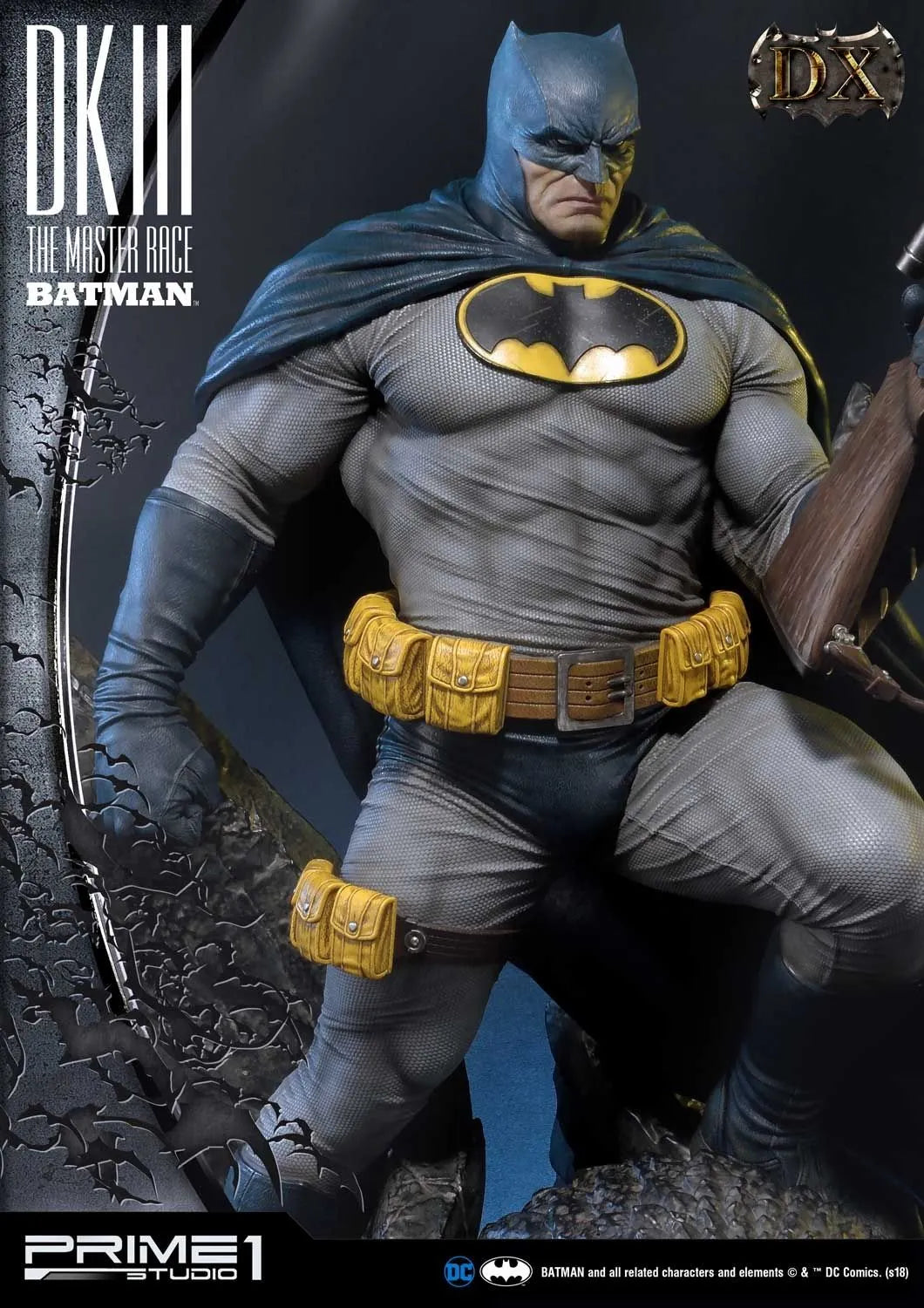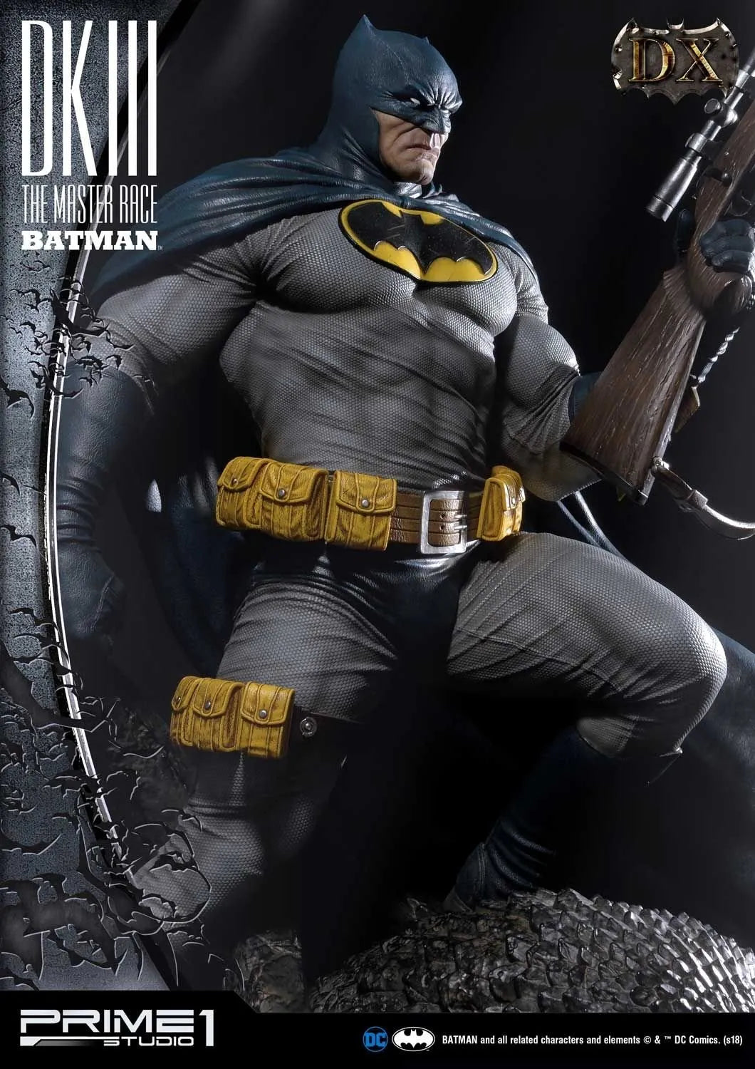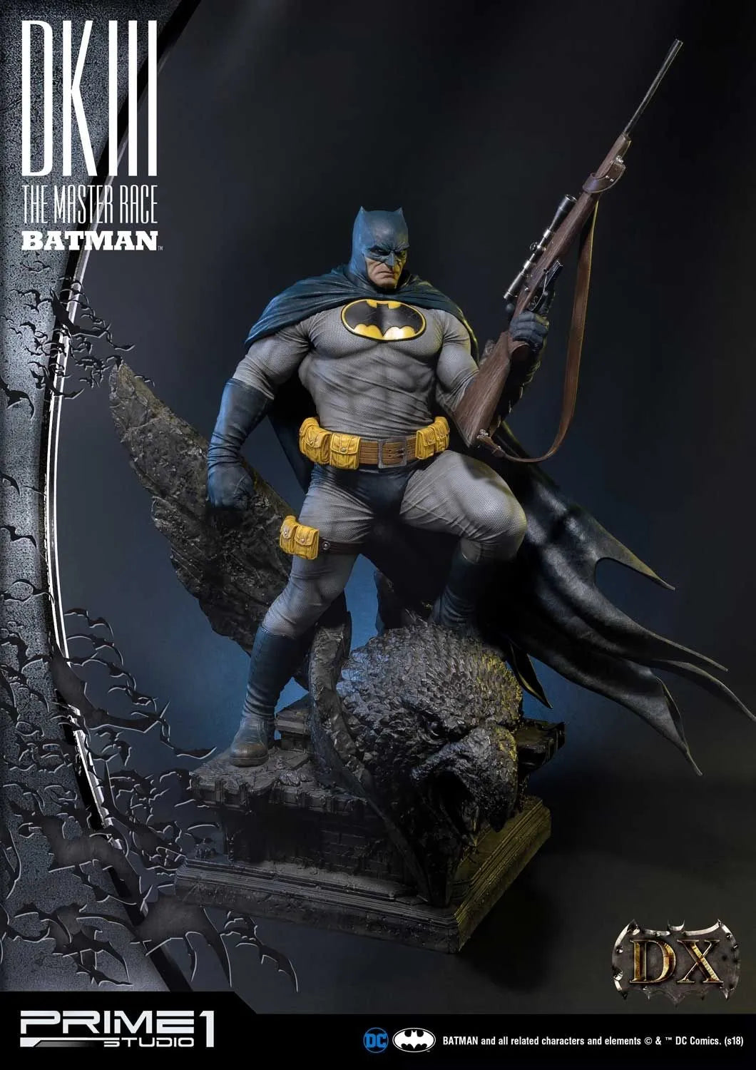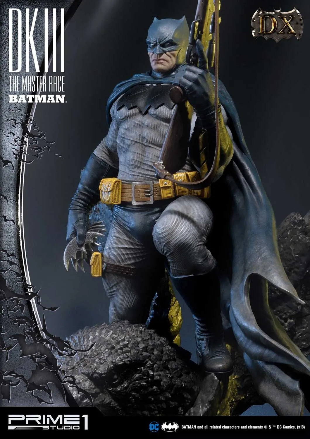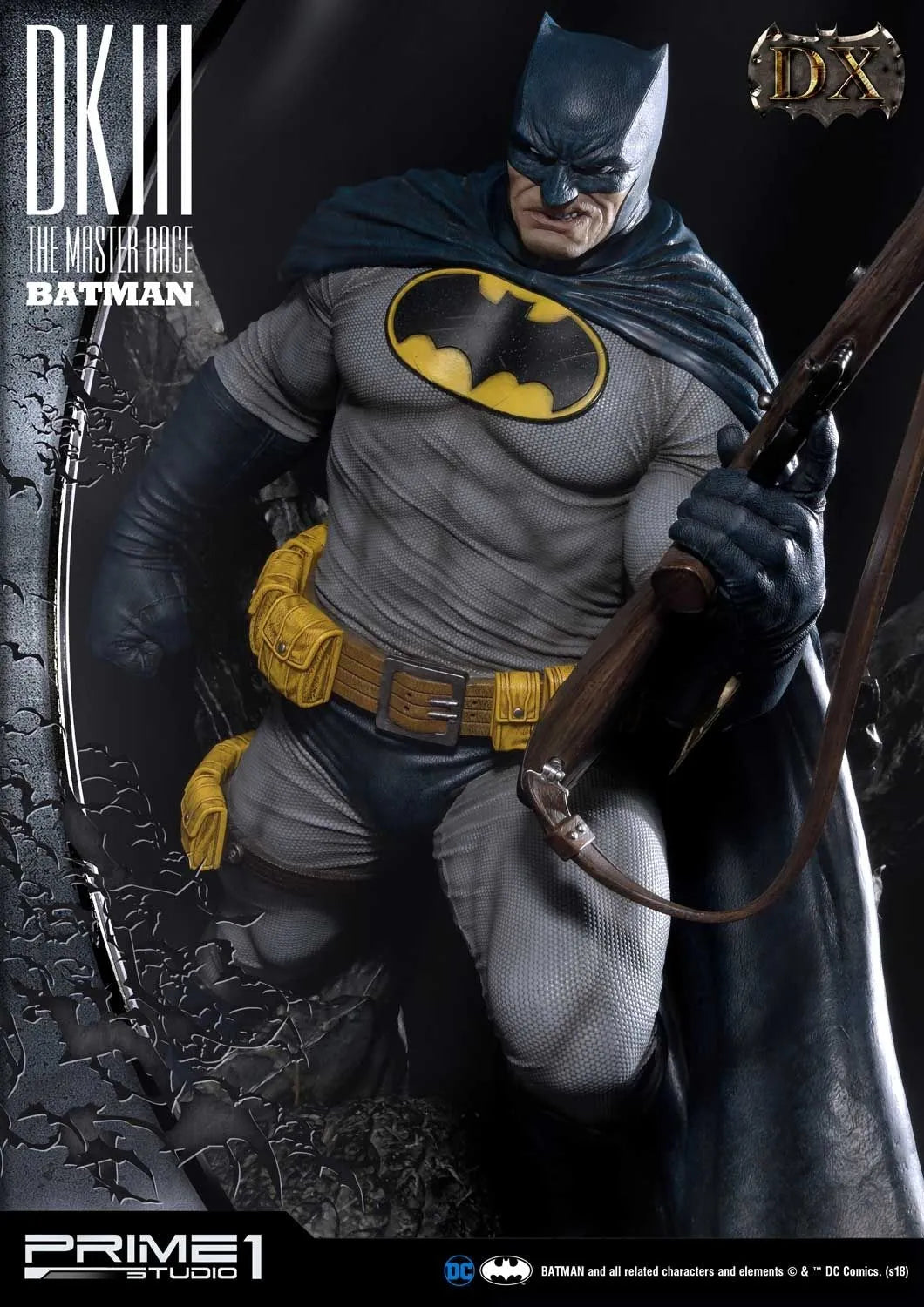 A Prime 1 Studio tem o orgulho de apresentar a MMDCDK3-01DX em escala 1/3: Versão Deluxe do Batman de The Dark Knight III: The Master Race. The Dark Knight III: The Master Race, também estilizado como DK III: The Master Race, é uma série limitada de nove edições da DC Comics co-escrita por Frank Miller e Brian Azzarello e ilustrada por Miller, Andy Kubert e Klaus Janson. Já se passaram 3 anos desde que Batman esteve ativo pela última vez. Nesse tempo, a maioria acredita que ele desapareceu ou morreu, rejeitando a ideia de que ele poderia voltar. Eles estavam errados. Uma foto do que parece ser o Batman é tirada, mostrando-o derrubando impiedosamente policiais que iam atirar em um garoto desarmado. A mídia, claro, explode, e tudo o que se fala é sobre o retorno do Batman. A série é uma sequência da minissérie do Batman de 1986 de Miller, continuando a história de um envelhecido Bruce Wayne retomando sua identidade como combatente do crime, auxiliado por sua ajudante Carrie Kelley (Robin) e apresentando um elenco de personagens do Universo DC, incluindo Superman, Lanterna Verde e Mulher Maravilha.