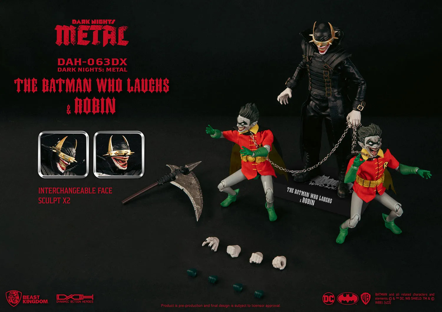 Em Dark Knights MetalTanto o Batman quanto seu parceiro Robin foram corrompidos pelo veneno do Coringa, tornando-se alguns dos vilões mais temidos no Multiverso Sombrio. Com entre 20 e 26 pontos de articulação, O Batman Que Ri ganha vida em escala 1:9, vestindo seu traje característico com espinhos feito de couro sintético, e os Robins Enfurecidos exibem suas clássicas cores vermelha e verde com uma corrente de metal de verdade!