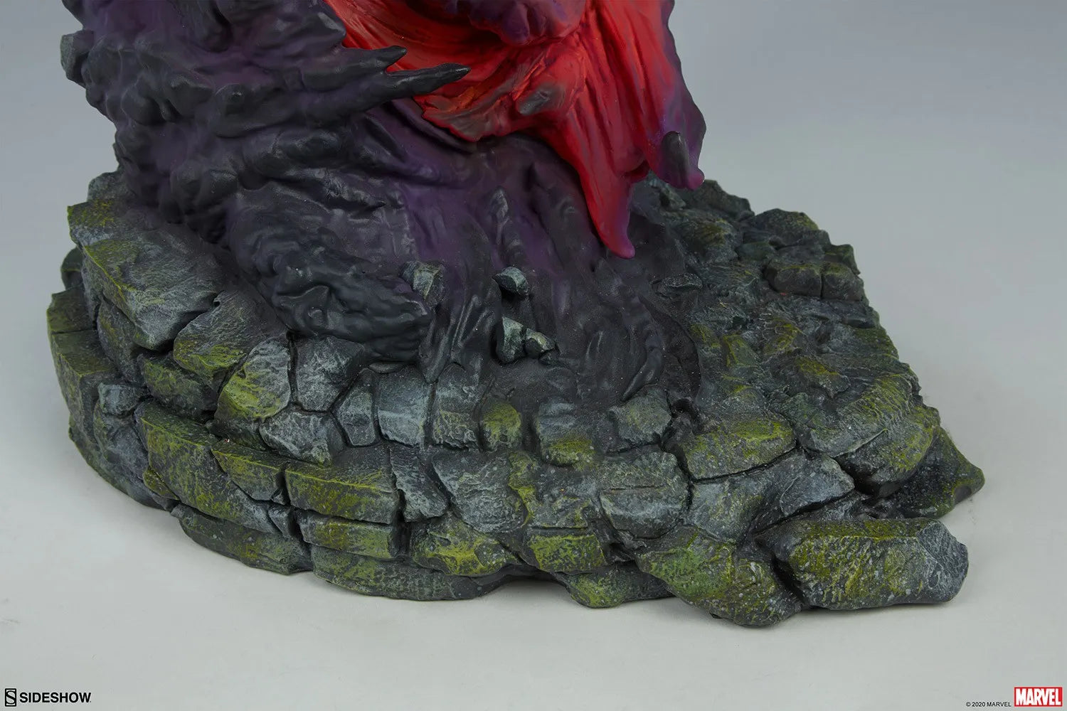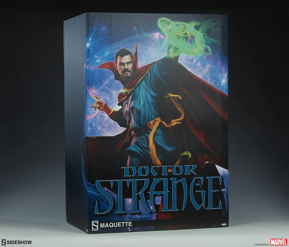 Inspirada em sua clássica aparência dos quadrinhos, a maquete de poliresina do Doutor Estranho apresenta um traje esculpido em azul e amarelo e uma Capa de Levitação totalmente em tecido. Esta luxuosa capa de tecido vermelho é forrada com acabamento dourado, possui uma gola alta estilizada e conta com fios internos para poses, medindo 66 cm de largura em sua extensão máxima. As vestes azuis de Stephen Strange, o cinto marrom e as luvas e faixa amarelas são todos esculpidos com detalhes de movimento de tecido e costuras realistas. No centro de seu peito está o Olho de Agamotto, um antigo amuleto de sabedoria que empodera e protege este defensor místico da humanidade.
