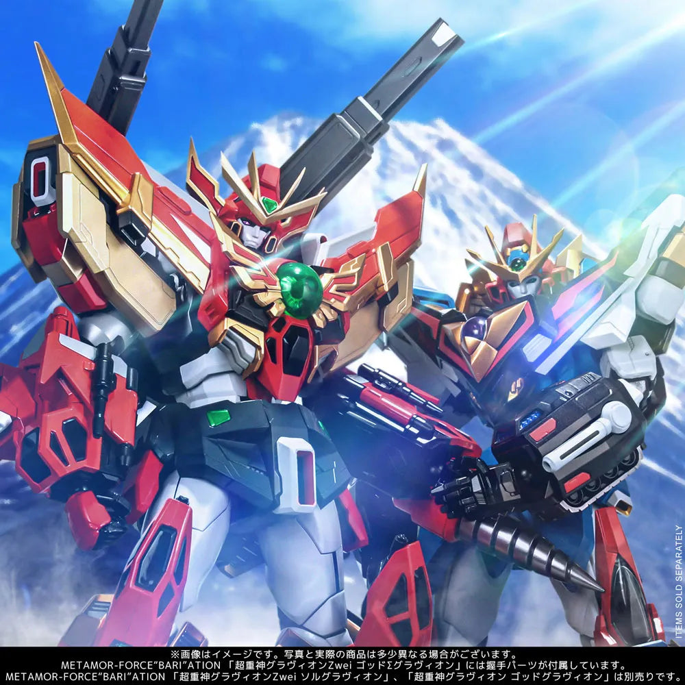 O item mais recente que será lançado na série METAMOR-FORCE "BARI"ATION, que apresenta uma colaboração completa com o Sr. Masami Obari, é o tão aguardado God Σ Gravion pilotado por Sandman! O brinquedo vem com um mecanismo de combinação que permite ao GranΣ se combinar com os Grandivas para formar God Σ Gravion. Além de várias armas, o Graviton Lancer e a Espada Divina Balmung para o GranΣ estão incluídos. Partes transparentes e metal fundido são generosamente usados por todo o corpo. Além disso, a parte de aperto de mãos está incluída para que você possa reproduzir a famosa cena de Sol Σ GRAVION e God Gravion apertando as mãos. O GOD Σ GRAVION da Sentinel, cheio de amor de Sandman, está finalmente completo!