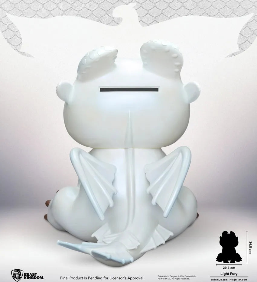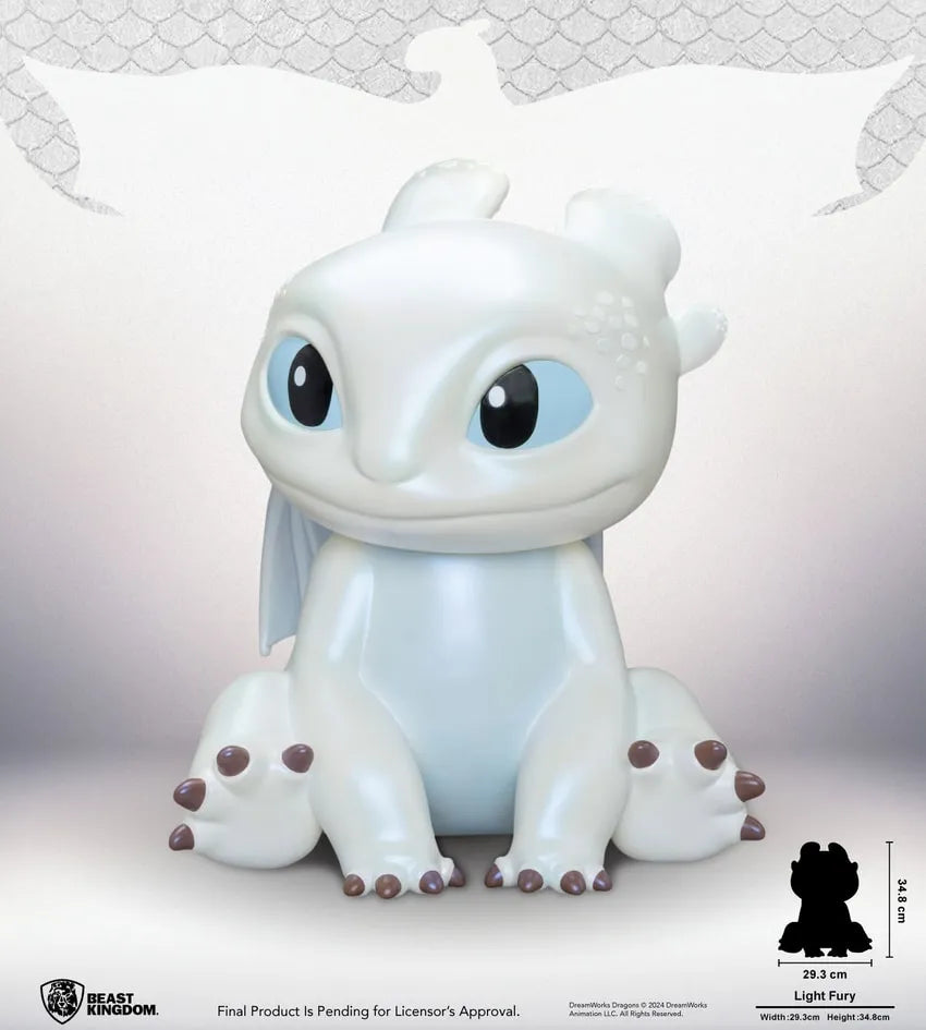 Após o cofrinho de vinil do Banguela, A marca "Entertainment Experience" da Beast Kingdom leva os colecionadores sérios de volta ao filme com o lançamento de uma estátua altamente colecionável "Master Craft" da versão de Michael Keaton do filme do Multiverso DC "The Flash". agora é oferecido o cofrinho Fúria da Luz. Esta nova figura funcional apresenta escamas lisas e placas de chifre macias. Seus olhos encantadores e sorriso farão você querer economizar seu dinheiro com ela.