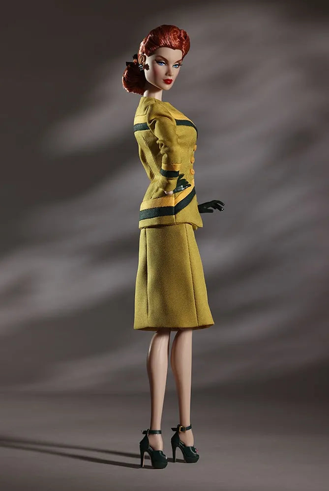 • Conjunto de saia mostarda perfeitamente ajustado, inspirado na época, com detalhes contrastantes em amarelo e verde floresta
