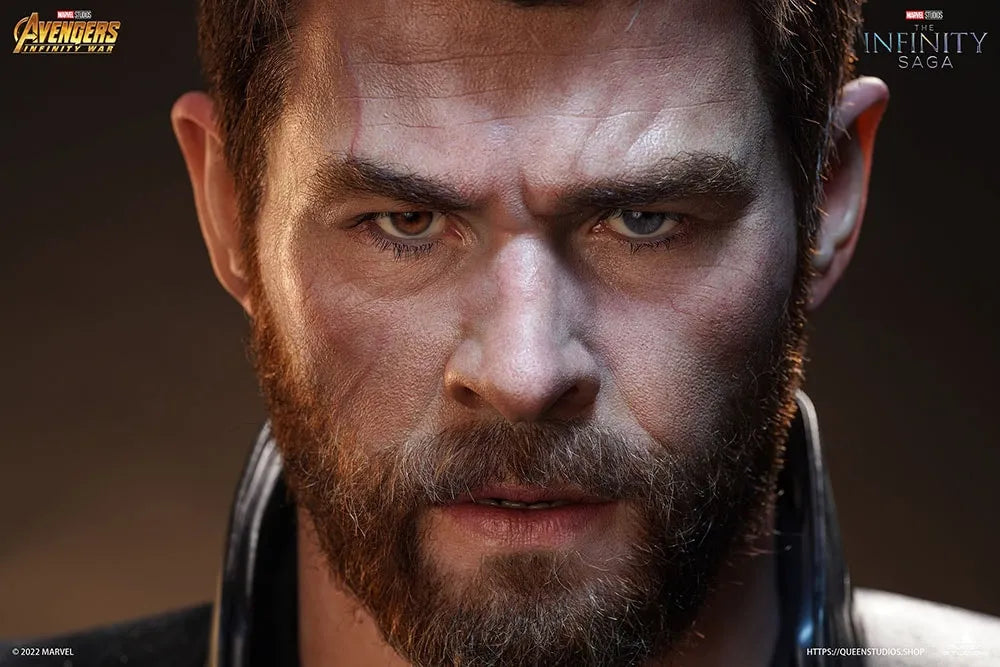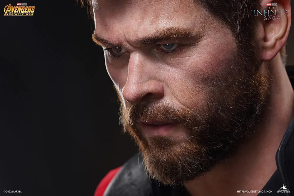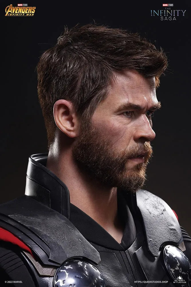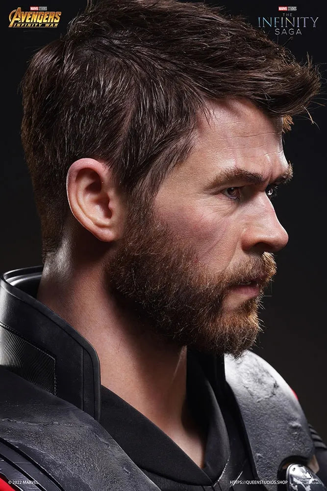 Este busto em tamanho real 1:1 é inspirado no Thor de Vingadores: Guerra Infinita da Marvel Studios. O busto tem 73 cm de altura e captura o Deus do Trovão com armadura corporal fiel ao filme, cabelo loiro curto e barba aparada. Criado usando tecnologia de ponta e os melhores materiais, a Queen Studios equipe dedicou inúmeras horas na escultura da cabeça para capturar a semelhança do personagem com precisão impressionante.