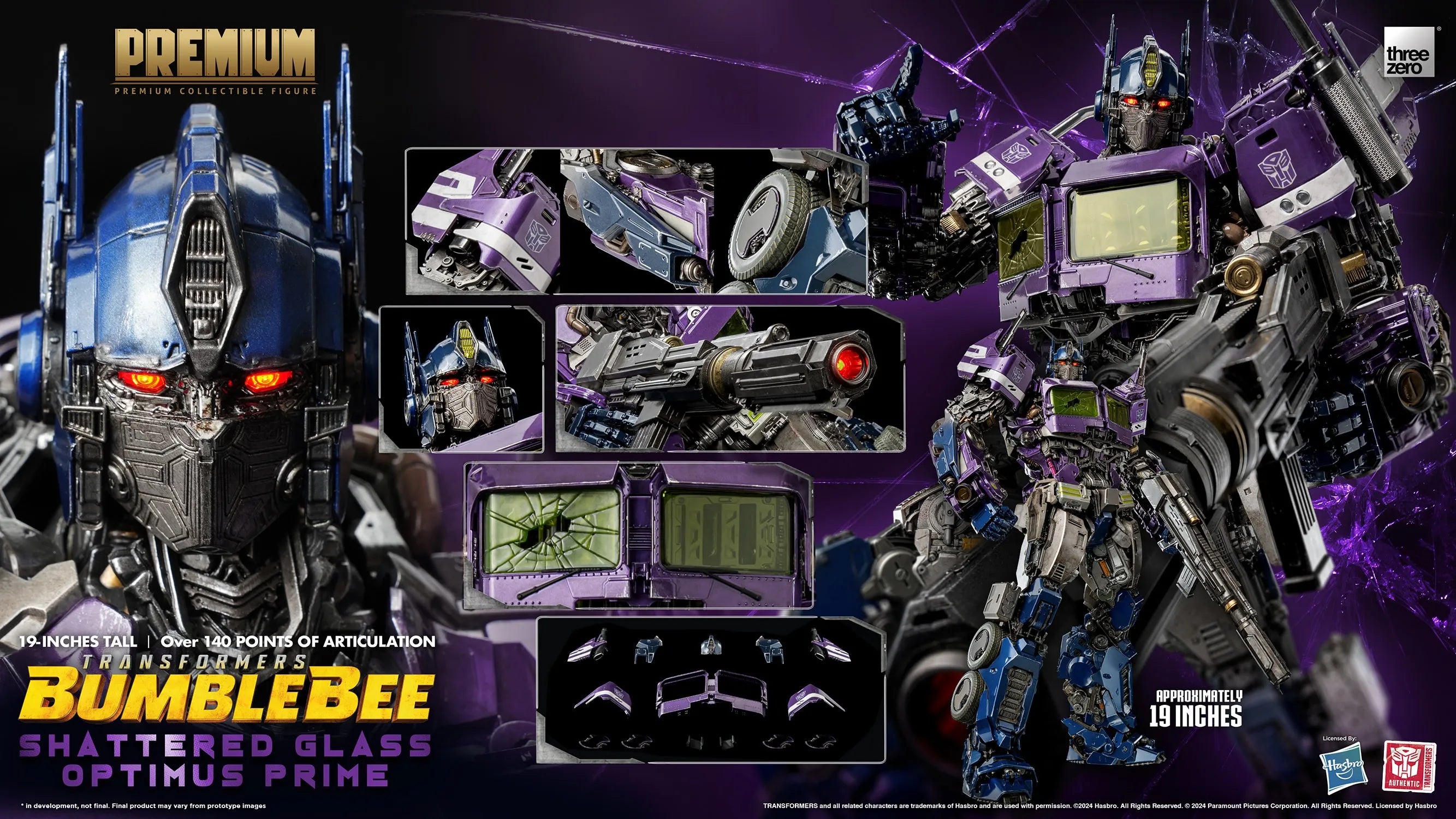 Com impressionantes 48 cm de altura (aprox.), a figura colecionável Transformers: Bumblebee PREMIUM Shattered Glass Optimus Prime possui mais de 140 pontos de articulação, incluindo dedos articulados individualmente. Componentes adicionais incluem olhos iluminados por LED e peças de armadura intercambiáveis que permitem exibir a figura tanto no Modo Terra quanto no Modo Cybertron! Shattered Glass Optimus Prime vem equipado com um Ion Blaster iluminado por LED. O PREMIUM Shattered Glass Optimus Prime também possui uma Estrutura de Metal Fundido, adicionando um peso incrível e um acabamento tátil satisfatório à sua presença dinâmica! Esta edição limitada também inclui uma cobertura de cabeça alternativa (com pintura verde na testa), adicionando versatilidade à exibição.