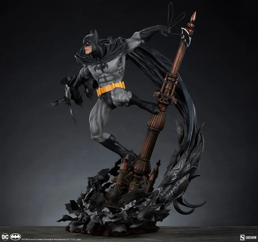 Medindo 68 cm de altura, 53 cm de largura e 51 cm de profundidade, a Figura em Formato Premium do Batman (Variante Preta) encontra o herói noturno de Gotham City equilibrado no topo de uma torre de igreja. O alter ego de Bruce Wayne busca pistas para ajudá-lo a resolver seu caso atual enquanto se agarra a uma torre torta bem acima das ruas da cidade. Enquanto uma colônia de morcegos voa ao redor e se transforma em sua longa capa esvoaçante, Batman se torna uma criatura da noite, capaz de perseguir qualquer inimigo através das sombras mais profundas e das alturas mais vertiginosas.