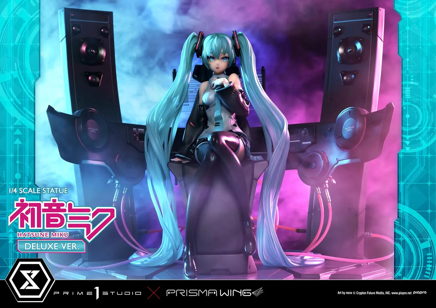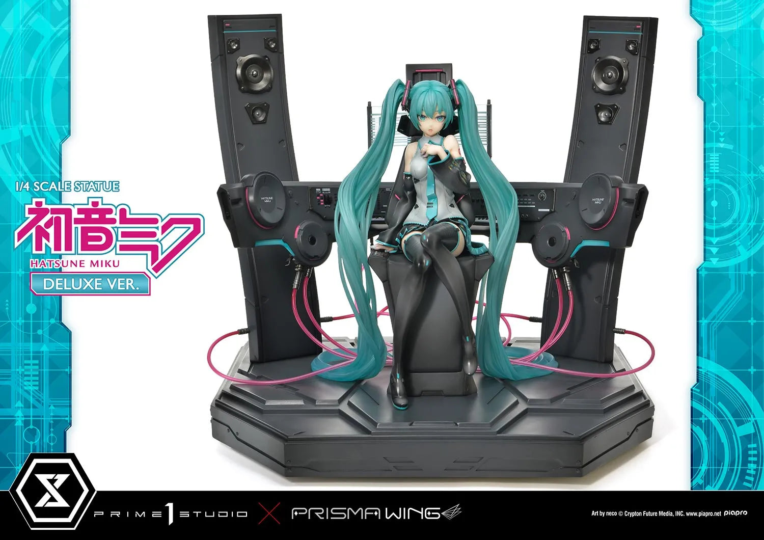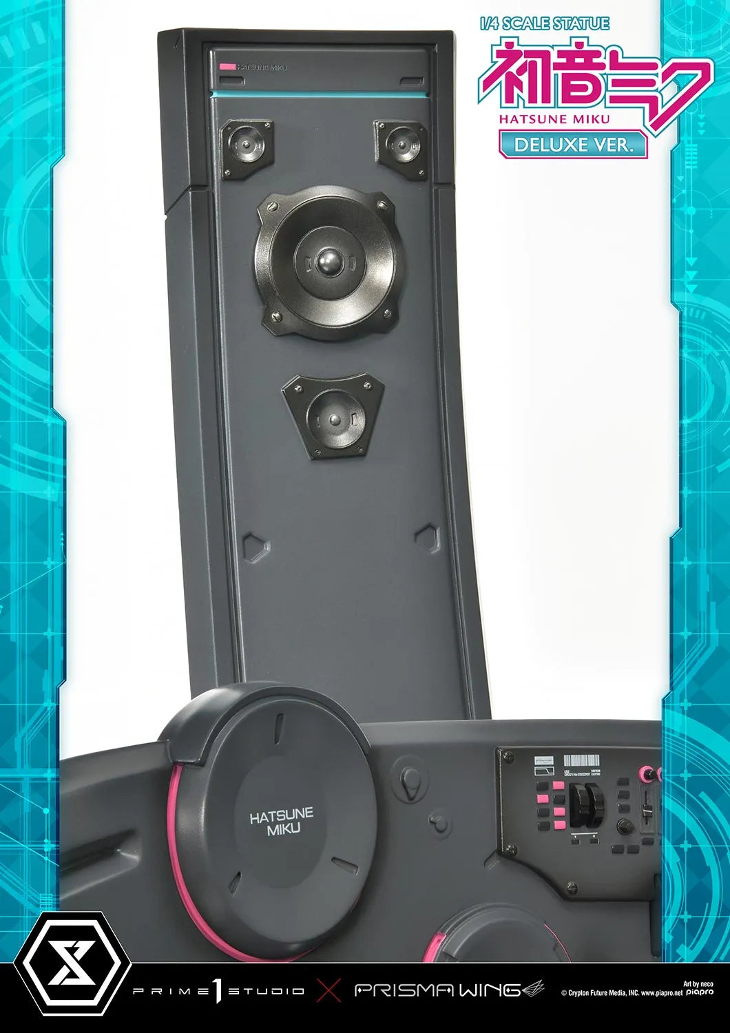 A versão Deluxe dessa representação da cantora também conta com uma base especializada em formato de sintetizador. Isso inclui um teclado de 88 teclas, um monitor transparente com falas gravadas, além de 2 impressionantes alto-falantes. Os detalhes requintados esculpidos em polystone fazem referência a muitas de suas músicas mais famosas. Esta peça faz um grande uso de simetria estilosa, presente na criação das tranças gêmeas de Miku enquanto ela se senta no centro da peça, assim como os 2 grandes alto-falantes e cabos rosa. Uma vez que você compra esta estátua, pode desfrutar plenamente de cada detalhe refinado deste design ao máximo.