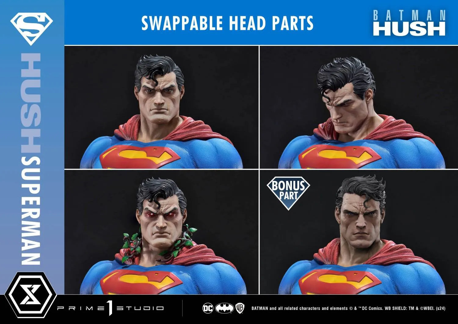 Esta versión incluye tres cabezas intercambiables con diferentes expresiones: una mirando hacia adelante, otra hacia abajo y una en la que Superman está bajo el control mental de Hiedra Venenosa. Tú, el director, decides qué escena quieres recrear.