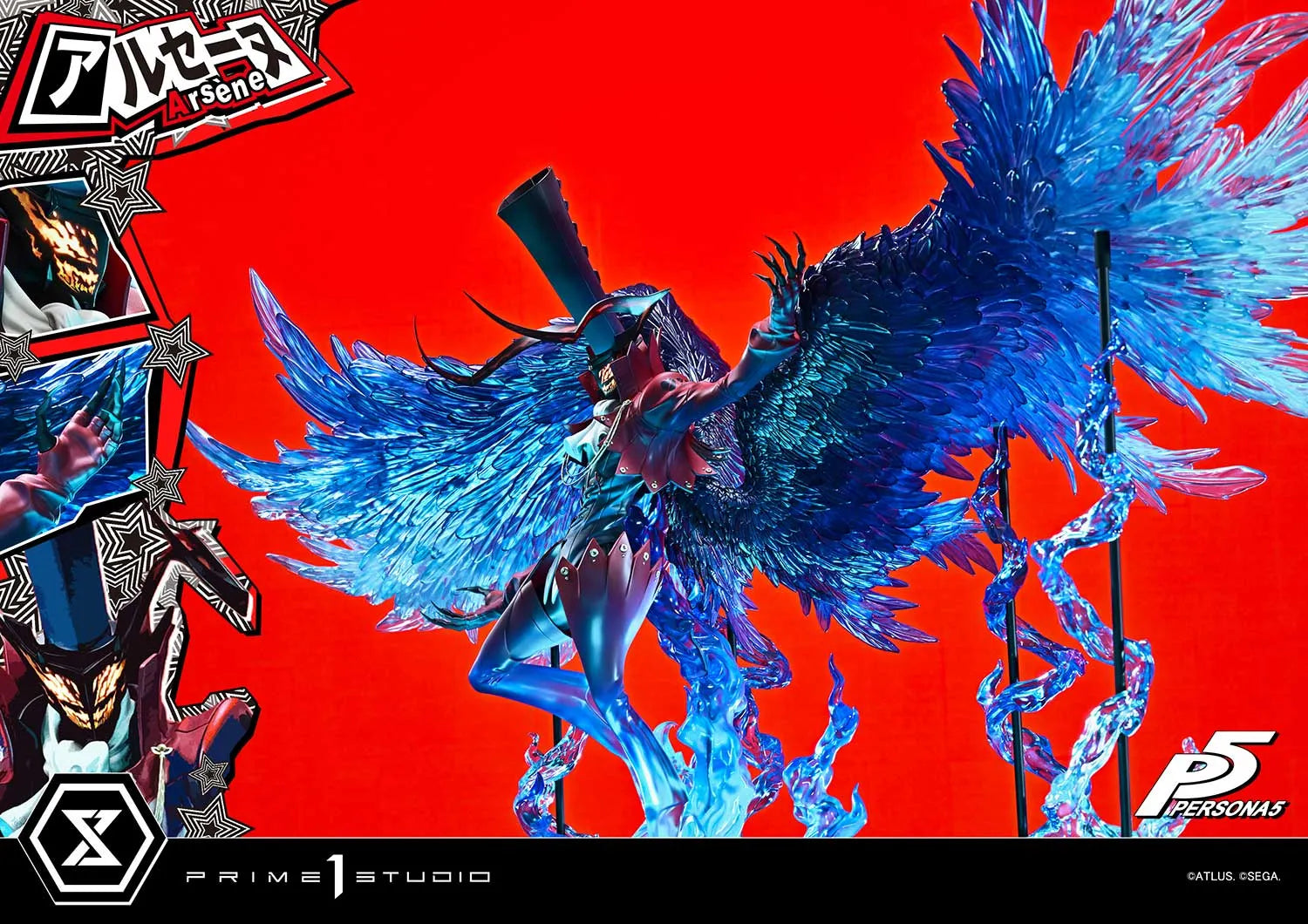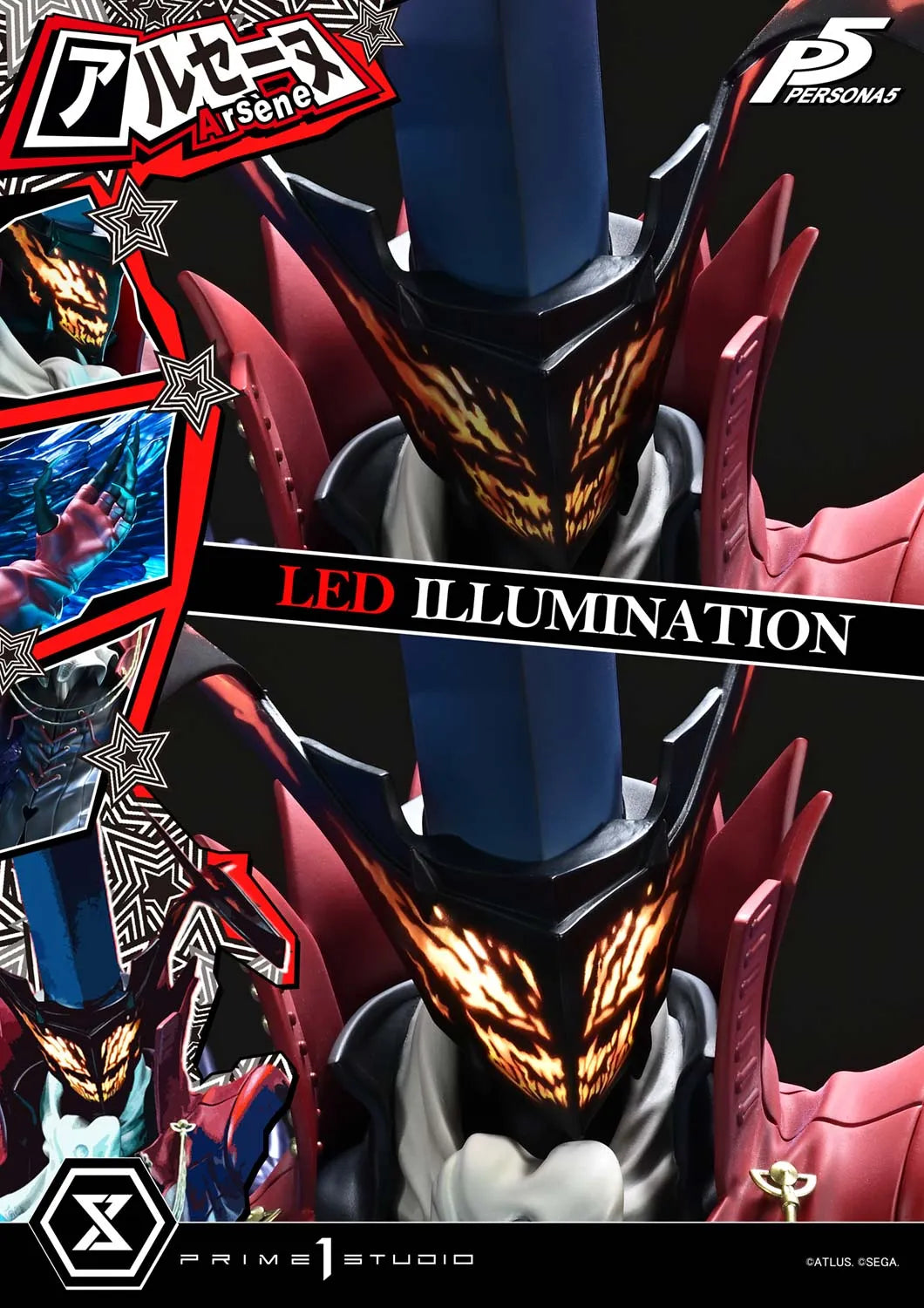 Cada detalhe cavalheiresco do design de Arsène harmoniza a identidade visual do jogo com texturas do mundo real. Dos tons icônicos de vermelho e das curvas ascendentes de seu adereço de cabeça às dobras suaves e esculpidas do cachecol em seu peito, cada elemento foi criado sem compromissos. Especialmente chamativa é a chama azul vívida que surge debaixo de seus pés. As asas e pernas refletem as mesmas texturas flamejantes, capturando o exato instante de sua materialização. Sua cabeça também possui um efeito de iluminação LED, iluminando uma expressão que evoca seu riso triunfante.