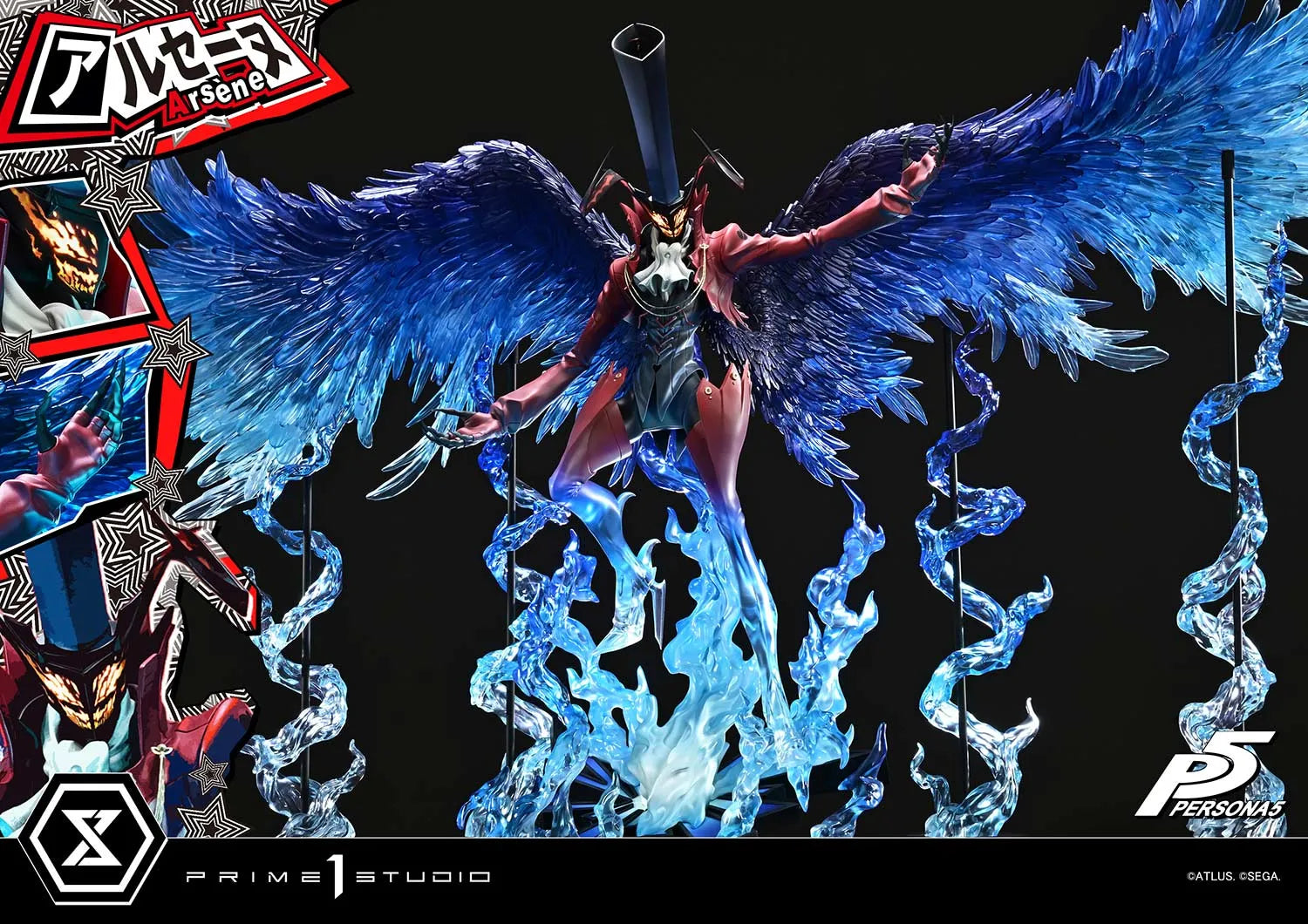 Arsène aparece no despertar do protagonista, e esta estátua captura esse momento icônico com uma presença imponente. Vestido com um impressionante traje bicolor de vermelho e preto, encimado por uma silhueta longa e semelhante a um chapéu, e coroado com asas negras expansivas—esta figura traz a admiração e a tensão da cena em uma escala de 1/4 de tirar o fôlego, medindo impressionantes 148 cm de largura.