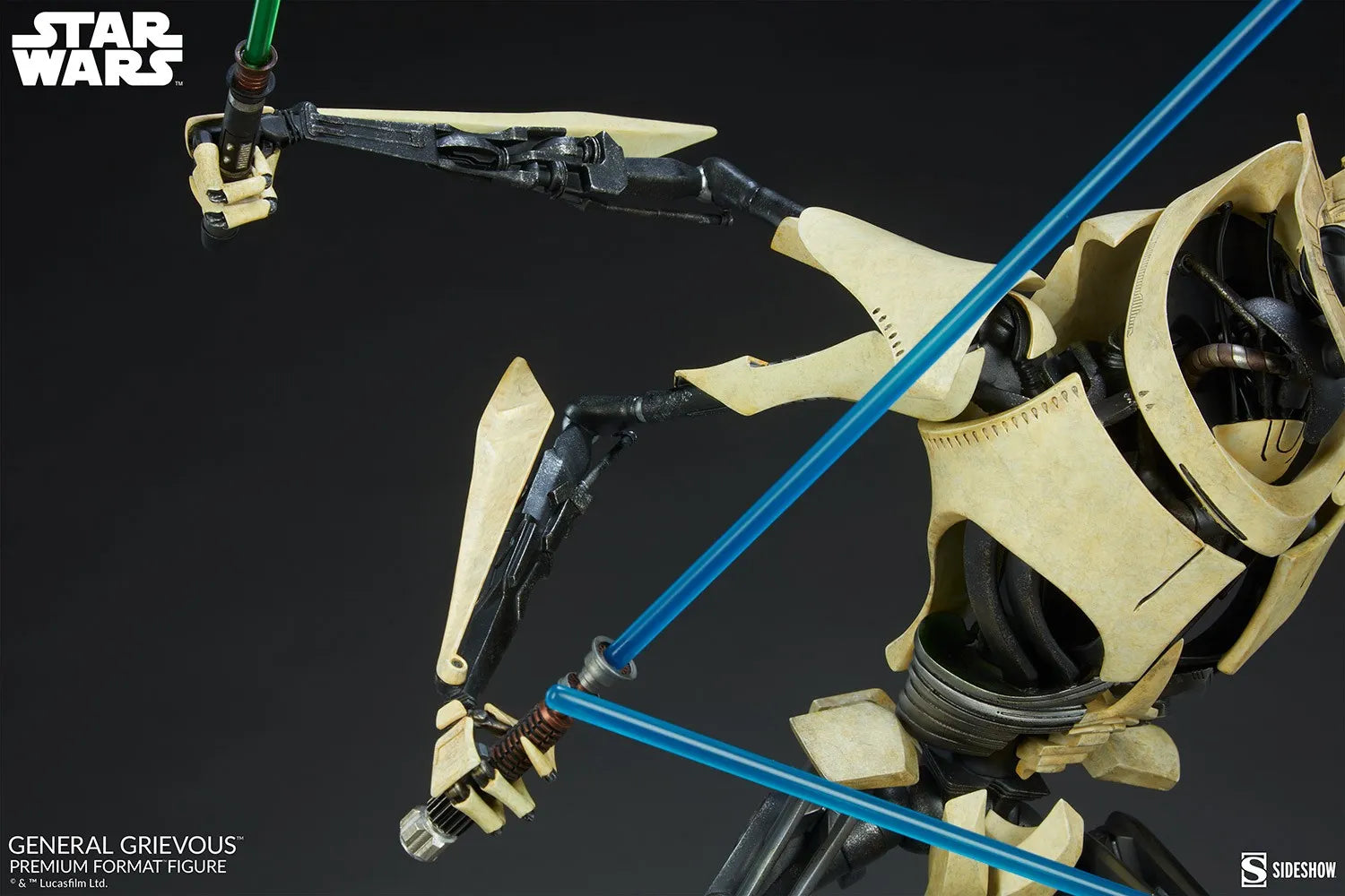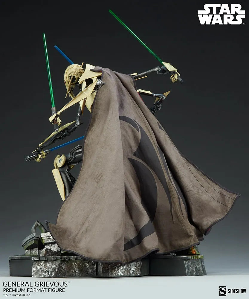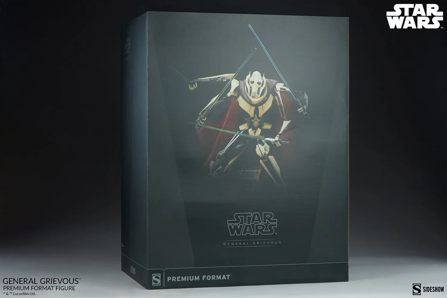 A Figura Premium Format do General Grievous mede 74 cm de altura e 51 cm de largura enquanto o ciborgue Separatista enfrenta seus inimigos sobre os destroços de uma base com tema de nave estelar. Treinado na arte do duelo de sabres de luz, ele empunha as armas de quatro Jedi caídos para liderar seus exércitos de droides à vitória no conflito das Guerras Clônicas.