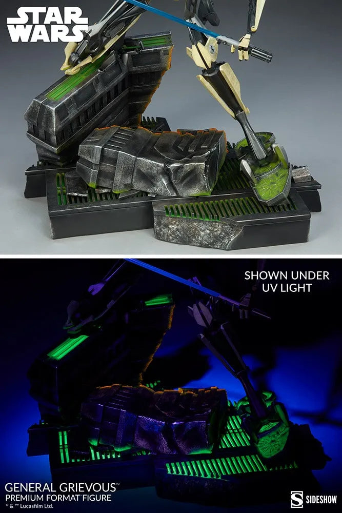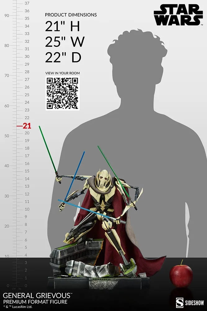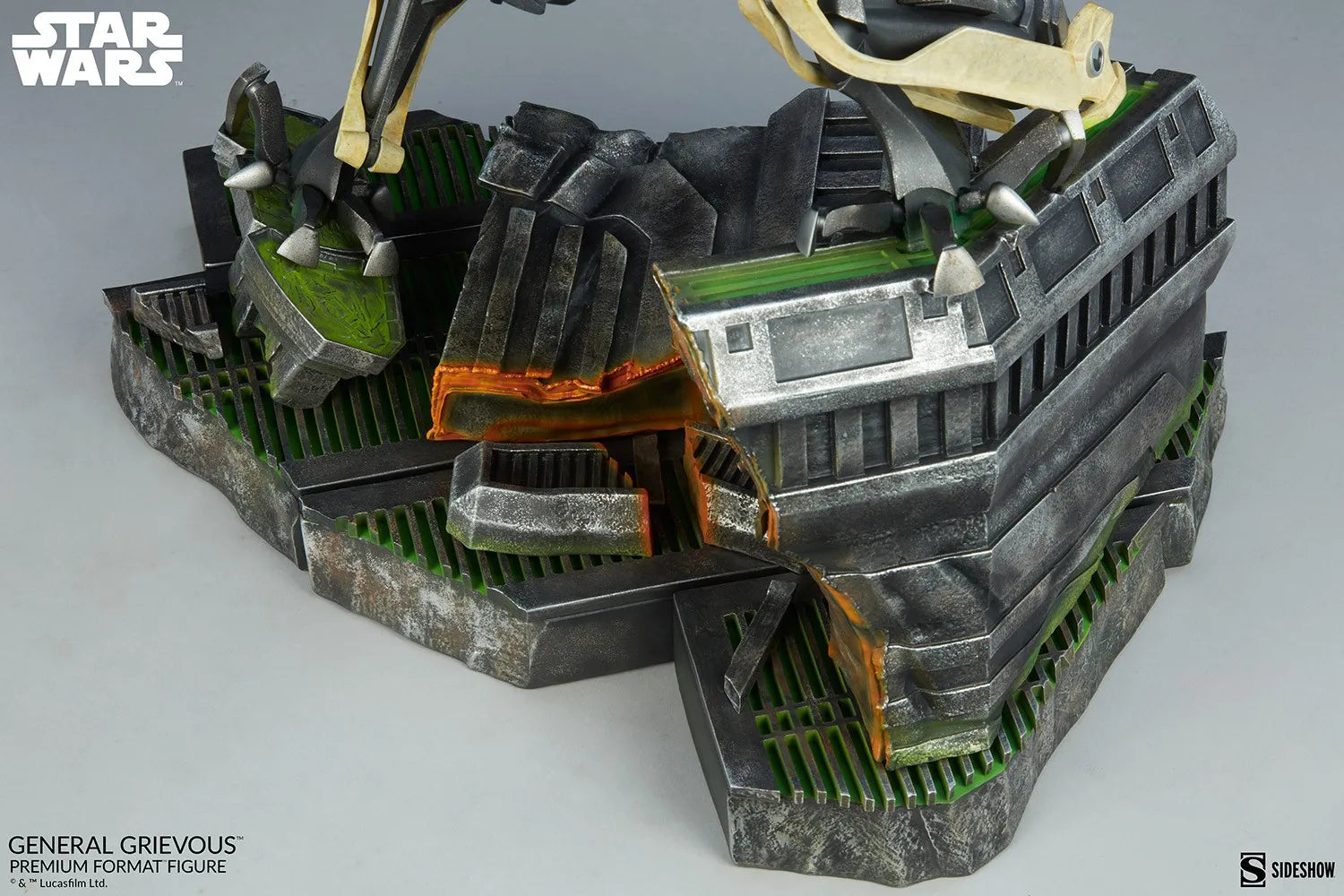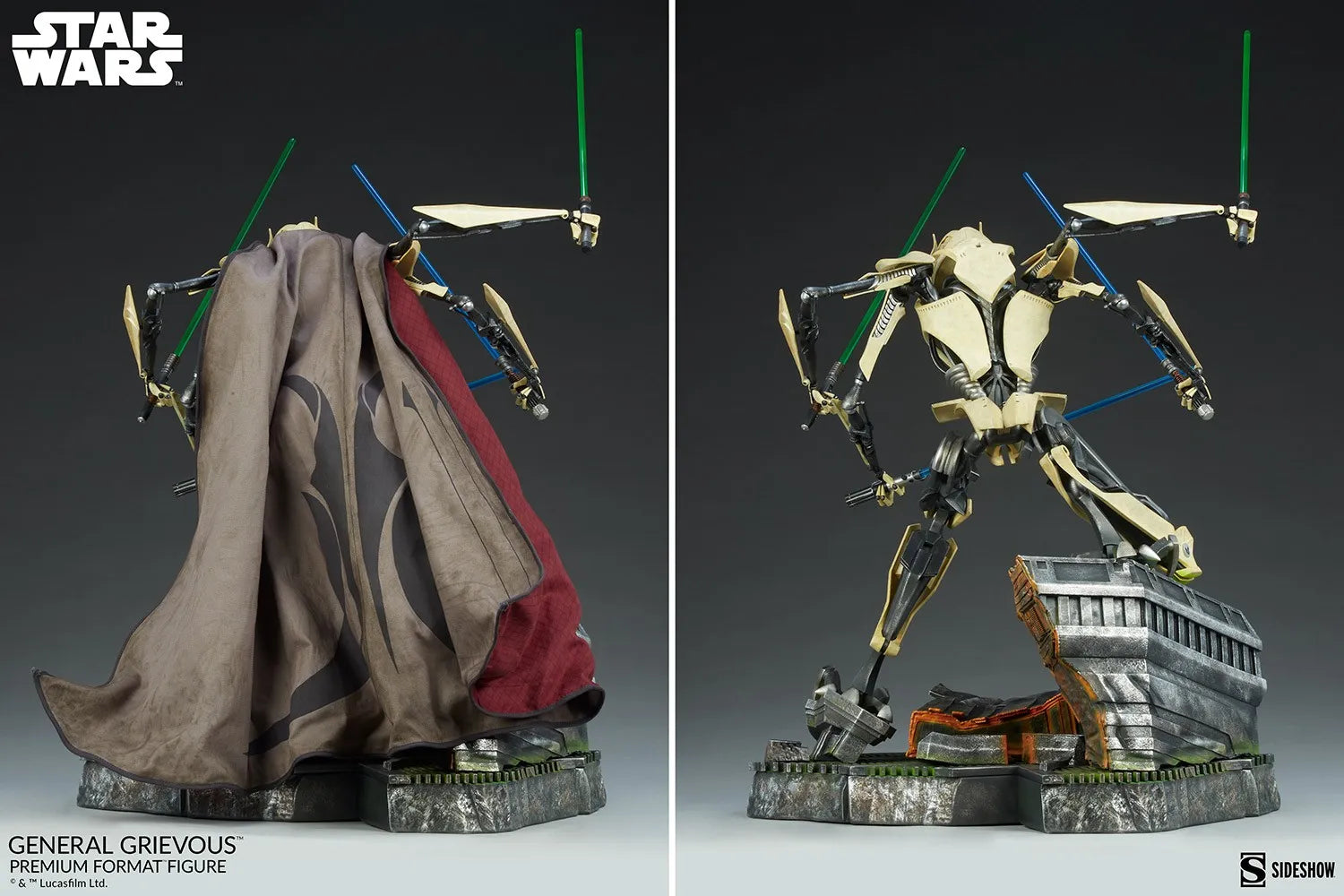 A Figura Premium Format do General Grievous mede 74 cm de altura e 51 cm de largura enquanto o ciborgue Separatista enfrenta seus inimigos sobre os destroços de uma base com tema de nave estelar. Treinado na arte do duelo de sabres de luz, ele empunha as armas de quatro Jedi caídos para liderar seus exércitos de droides à vitória no conflito das Guerras Clônicas.