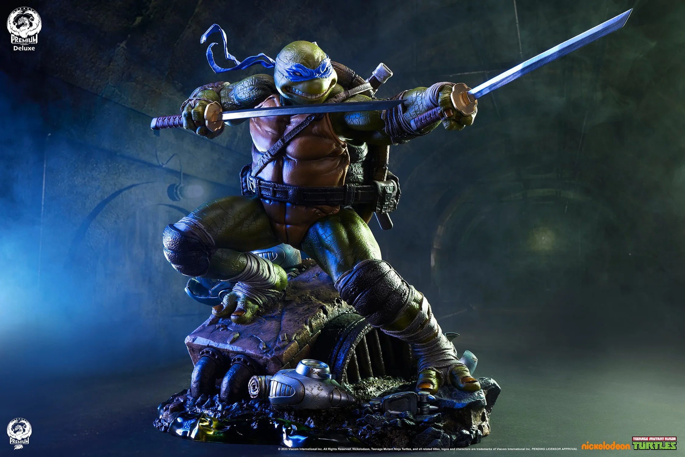 A estátua Leonardo em escala 1:3 mede 52 cm de altura e 48 cm de largura, representando o líder destemido e estoico das tartarugas, empunhando suas katanas características e posicionado em um cano de esgoto, preparado para enfrentar os ferozes Mousers e liderar seus irmãos à vitória no sistema de esgoto de Nova York.