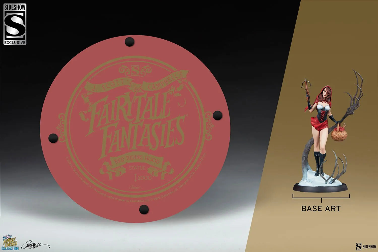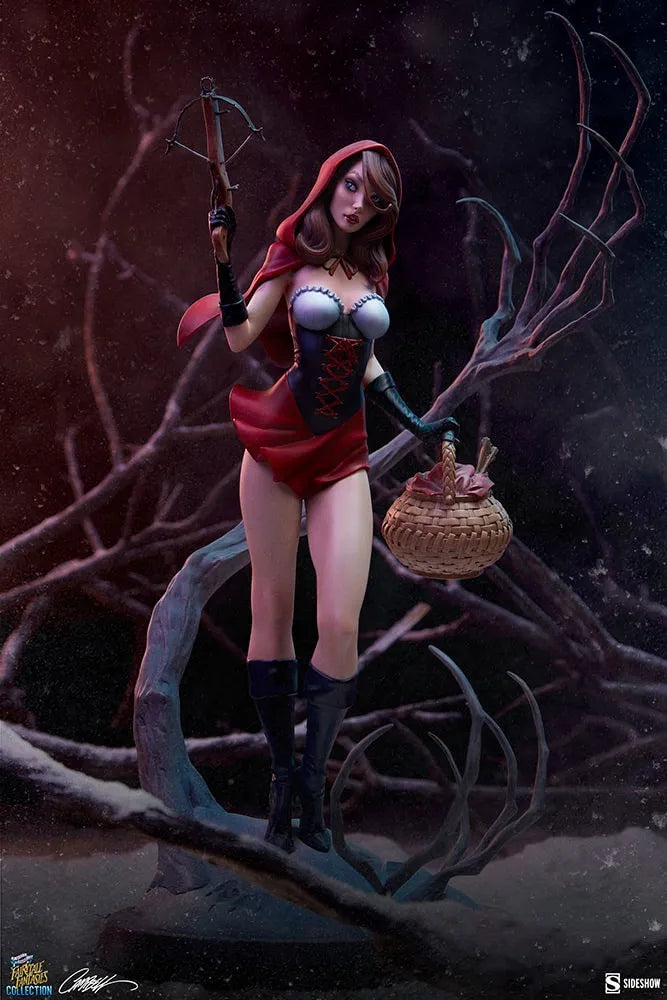 A Estátua da Chapeuzinho Vermelho em polystone mede 48 cm de altura enquanto a heroína de cabelos rubi perambula por um cenário de floresta invernal com sua cesta de guloseimas a tiracolo. Árvores com galhos em forma de garras tentam agarrá-la enquanto ela segue pegadas de lobo na neve, segurando sua besta caso as coisas fiquem complicadas. Chapeuzinho Vermelho veste um traje totalmente esculpido, projetado com um movimento dinâmico e varrido pelo vento em sua capa e saia carmesim, conferindo à destemida e feroz mulher um atraente apelo pin-up.