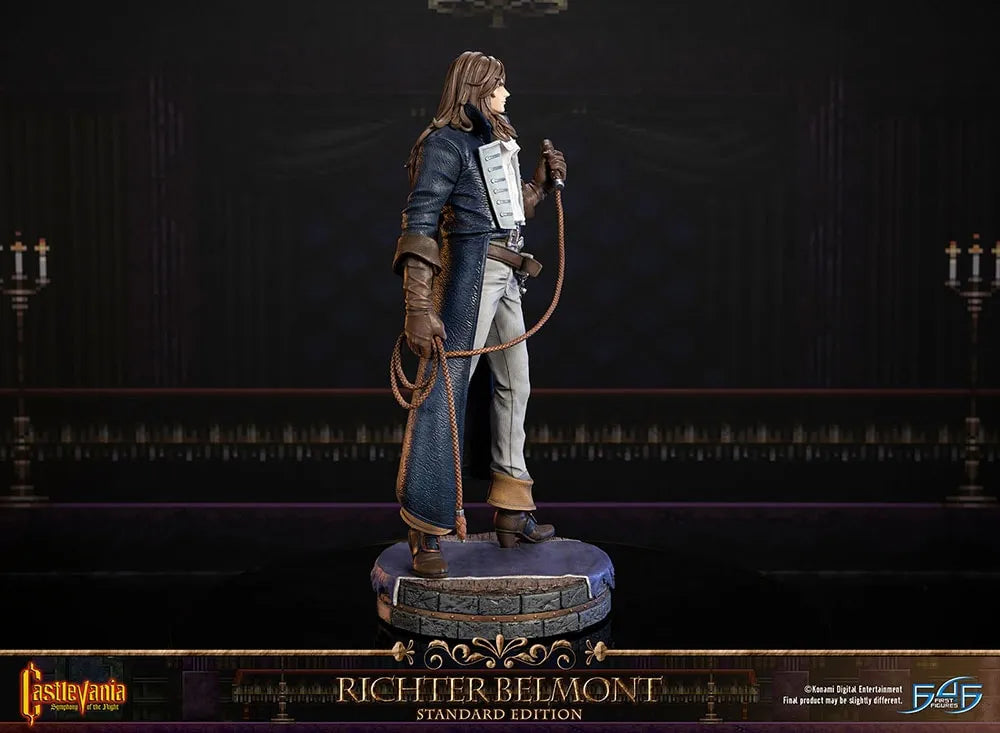 O maravilhosamente detalhado Richter Belmont se destaca empunhando sua icônica arma, o chicote "Vampire Killer". Seu traje é lindamente texturizado e os detalhes na bainha de sua espada são bem definidos. Ele está sobre uma base altamente detalhada, inspirada no tema e estilo do próprio videogame.
