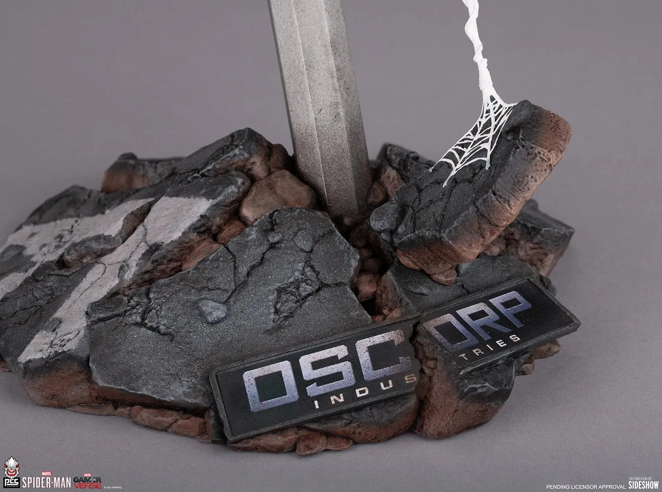 Inspirado no famoso videogame Marvel’s Spider-Man, o Diorama do Homem-Aranha: Traje Avançado em escala 1:6 mede 35 cm de altura e 33 cm de largura enquanto o herói amigão da vizinhança salta para a batalha sobre uma base de placa de rua. Parcialmente enterrada em escombros, a estrutura da cidade exibe o cruzamento da Broadway com a W 44 St em sua sinalização verde, enquanto um logo parcialmente destruído da Oscorp Industries pode ser visto nos destroços abaixo. Peter Parker lança uma linha de teia para agarrar um pedaço de concreto, criando a arma perfeita em um momento de aperto.