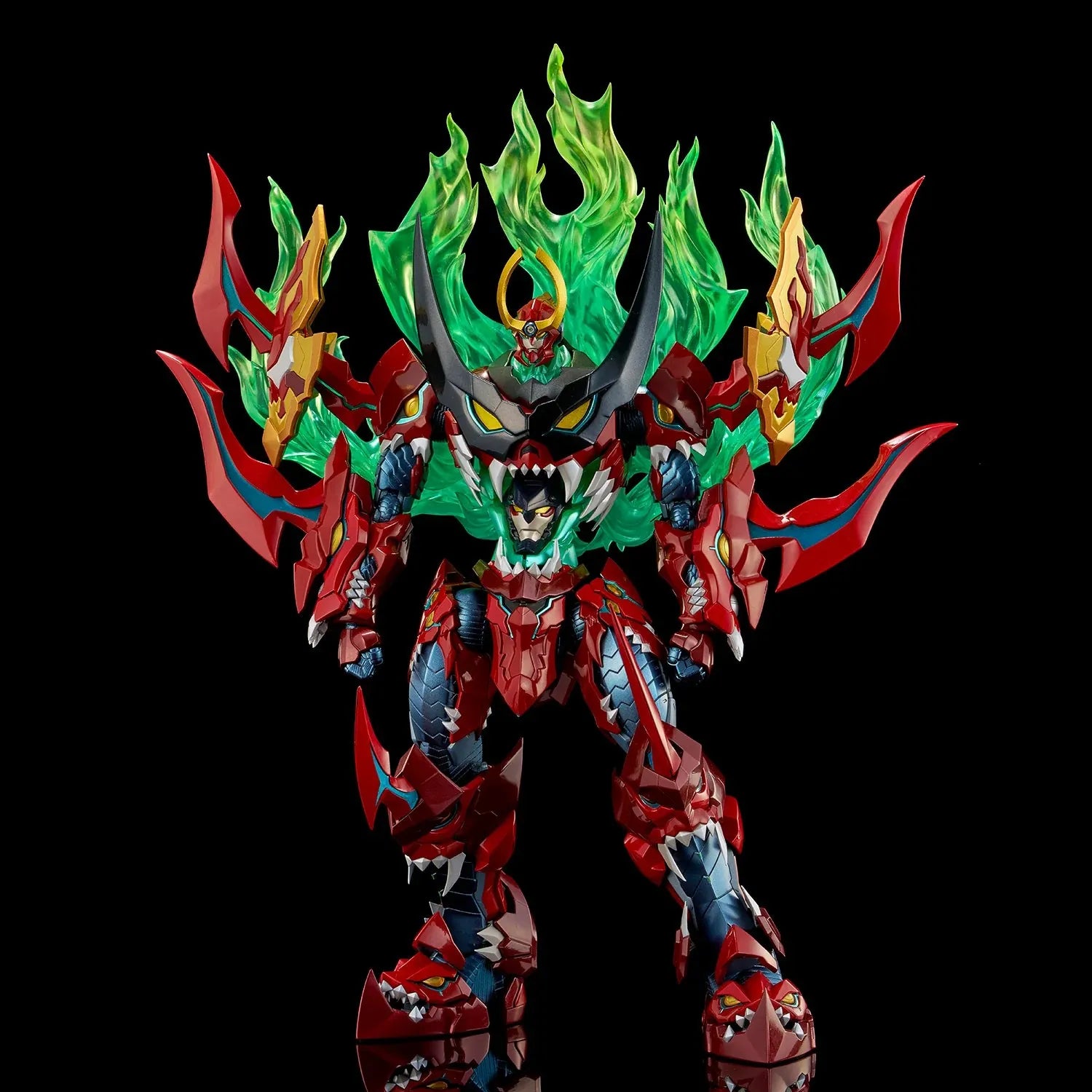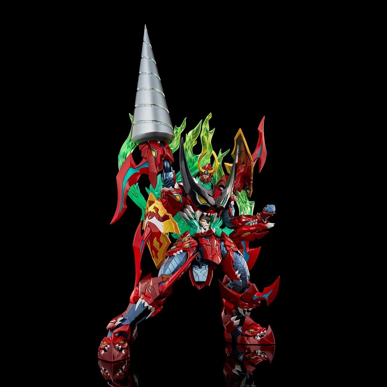 La cabeza mide aproximadamente 26 cm de largo y la altura total es de aproximadamente 35 cm, ¡incluyendo las piezas con efecto de llama! Esta figura incluye una cara intercambiable y dos juegos de manos. ¡El Giga Taladro y la Espada Enki también se pueden equipar en ambos brazos! La cara de Lazengann en el abdomen se puede reemplazar con una pieza de llama, y la pieza de llama de la espalda se puede quitar. Una opción alternativa es equipar la Espada Enki en el muslo. También cuenta con luces LED en los ojos y el pecho.