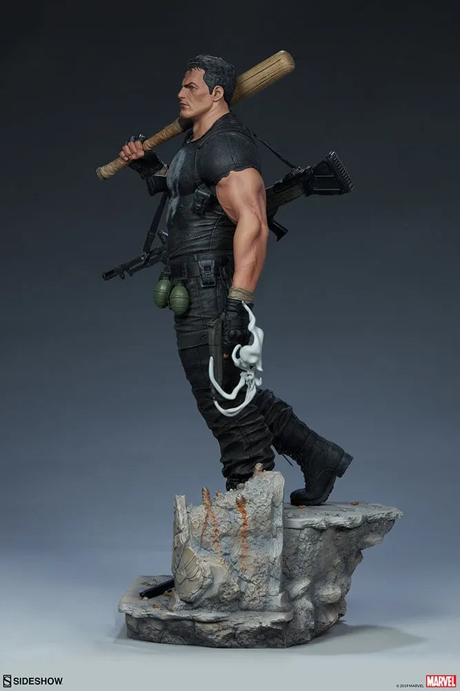 A Figura Premium Format™ do Justiceiro em resina apresenta um traje esculpido com texturas realistas que imitam tecido e desgaste. Do símbolo de caveira em seu peito ao visual desgastado de suas calças, o estilo vigilante característico de Frank Castle é capturado em detalhes imensos. O Justiceiro também vem equipado com uma variedade de equipamentos táticos, incluindo bolsas, granadas, uma metralhadora pesada e uma pistola recém-disparada. Uma nuvem de fumaça em forma de caveira sobe do cano da arma, servindo como um aviso para o submundo criminoso do Universo Marvel - Frank Castle está vindo para te parar.