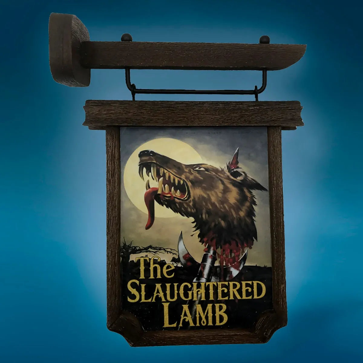 Uma réplica de alta qualidade oficialmente licenciada em escala reduzida da icônica Placa do Pub Slaughtered Lamb vista no filme Um Lobisomem Americano em Londres. Localizado nos remotos Pântanos de Yorkshire, O Slaughtered Lamb é o pub onde os mochileiros americanos David Kessler e Jack Goodman são avisados pelos frequentadores locais: "Fiquem na estrada, evitem os pântanos".