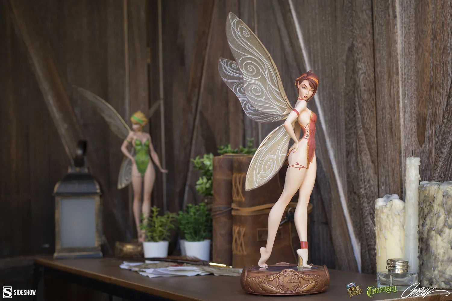 Baseada no estilo característico de J. Scott Campbell, Sininho brilha com um ar de magia travessa. A fada de poliresina tem asas detalhadas e translúcidas com uma envergadura de 30 cm, e seu vestido de folhas laranja é esculpido com texturas naturais que condizem com a nativa da Terra do Nunca. Seu retrato apresenta cabelos ruivos com uma mecha clara, e seus olhos e maquiagem complementam a atualização colorida. O visual de Sininho é completado com acessórios laranja combinando, incluindo seu colar, braçadeira, tornozeleira e as vinhas na coxa.