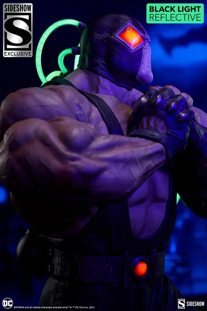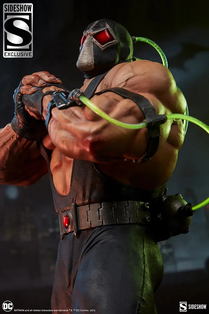 A Maquete do Bane em poliresina apresenta um traje totalmente esculpido e uma fisionomia incrivelmente musculosa, inspirada em sua aparência nos quadrinhos da DC. Ele veste um uniforme de luta livre preto, arranhado e manchado de sangue nos joelhos. Além disso, Bane usa botas com cadarço texturizado, um par de luvas pretas e um cinto prateado que segura o tanque de Veneno, que é bombeado para o vilão através dos tubos verdes vibrantes presos ao seu pescoço, cabeça e pulso esquerdo. Cada centímetro do Homem Que Quebrou o Morcego exala força intimidadora, sua forma maciça detalhada até as veias saltadas em seus braços.