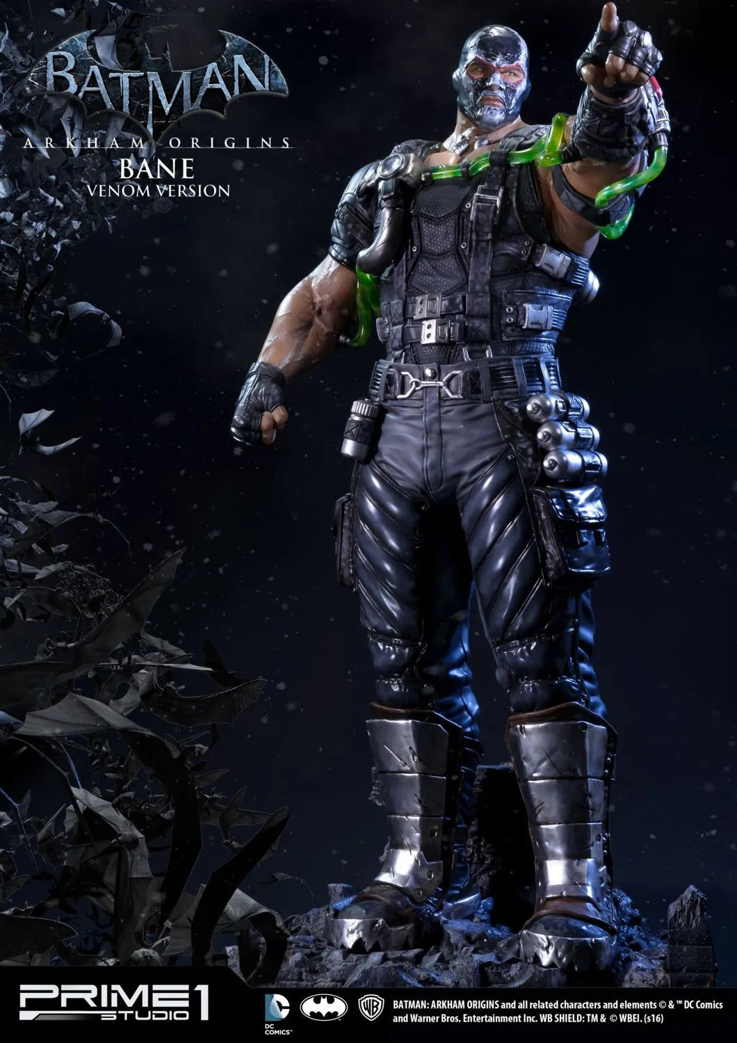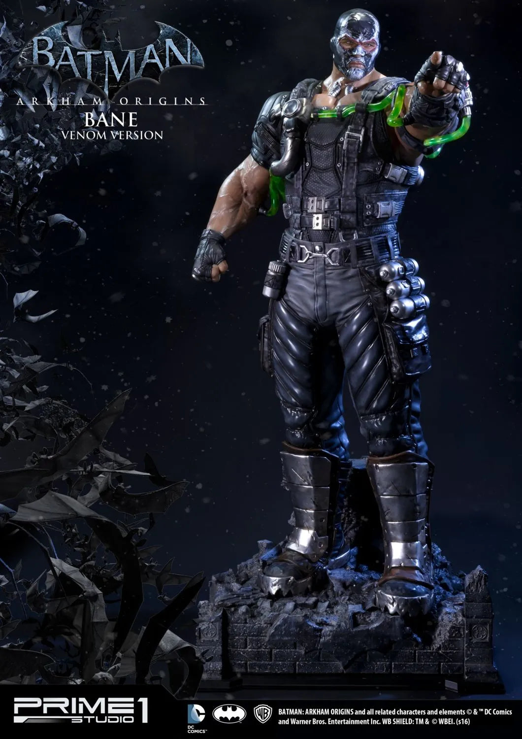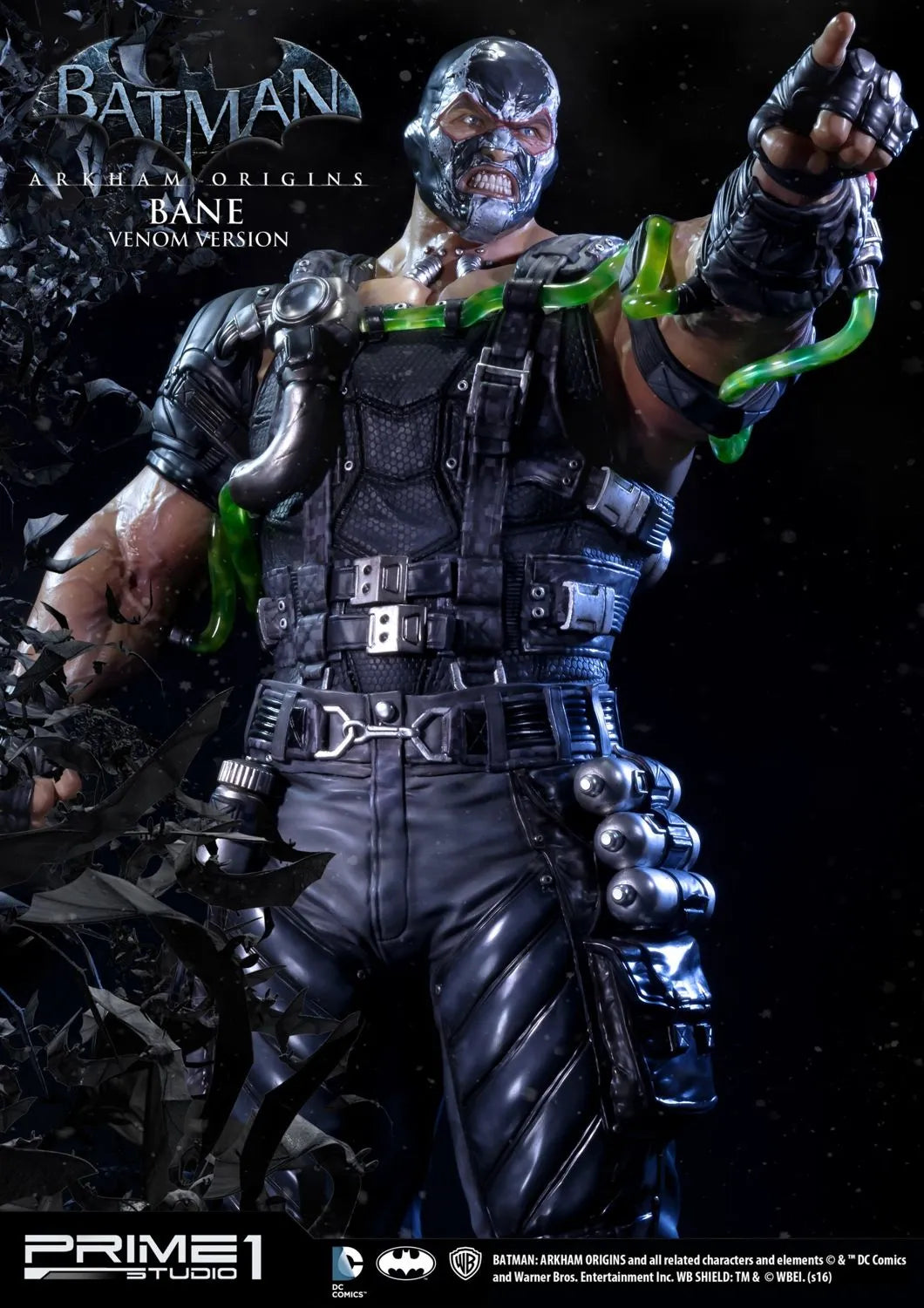 A Prime 1 tem o orgulho de apresentar a Estátua do Bane - Versão Venom em escala 1:3 de Batman: Arkham Origins. O mortal assassino é esculpido em aproximadamente 1:3 de escala com uma atenção excepcional aos detalhes. Ele se ergue com mais de 86 centímetros de altura e inclui um retrato intercambiável sem máscara e um Retrato Furioso. Um dos oito assassinos contratados para matar o Batman, apenas Bane é movido por uma necessidade fanática de conquistar Gotham City para formar seu próprio império criminoso.