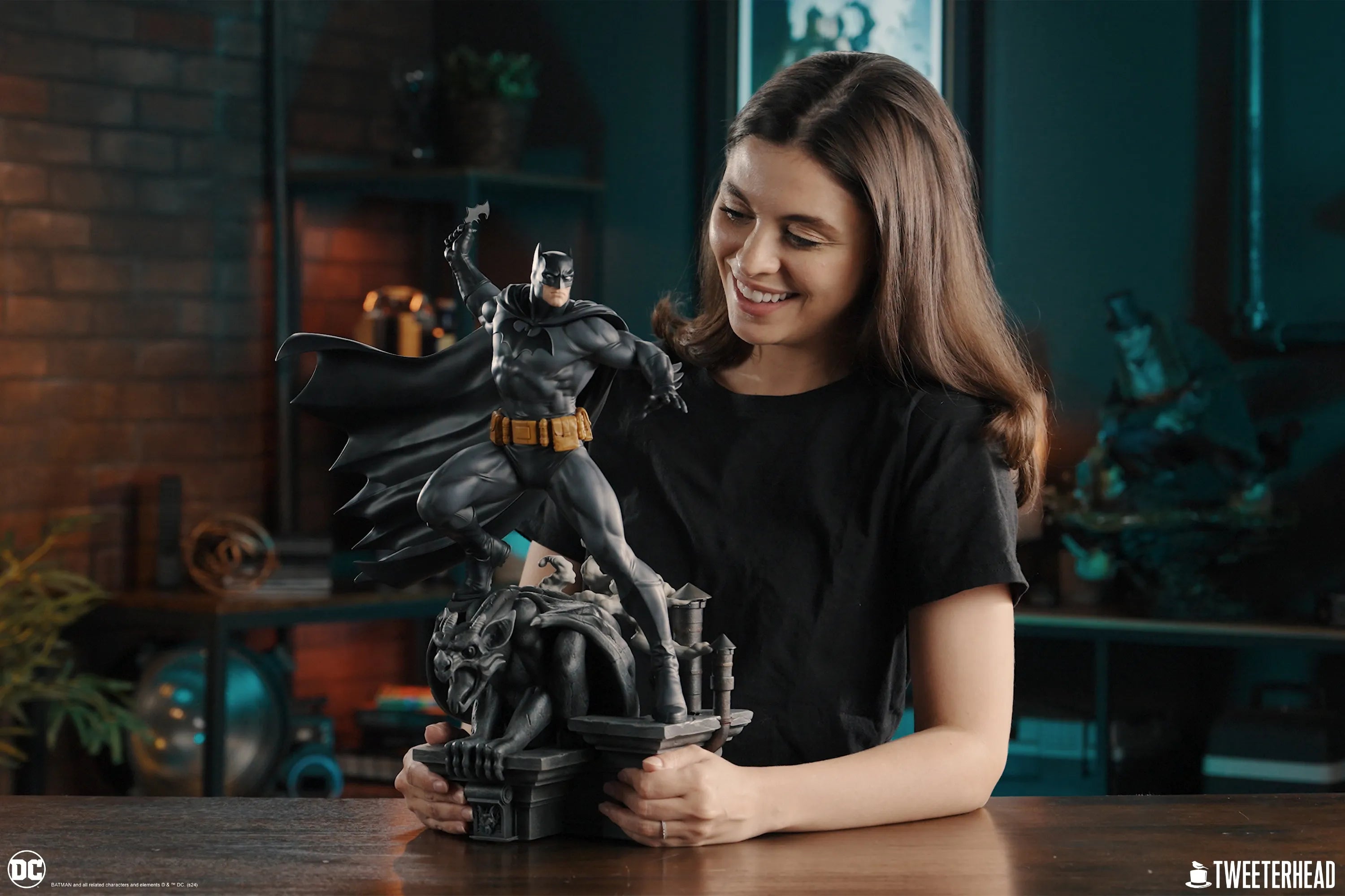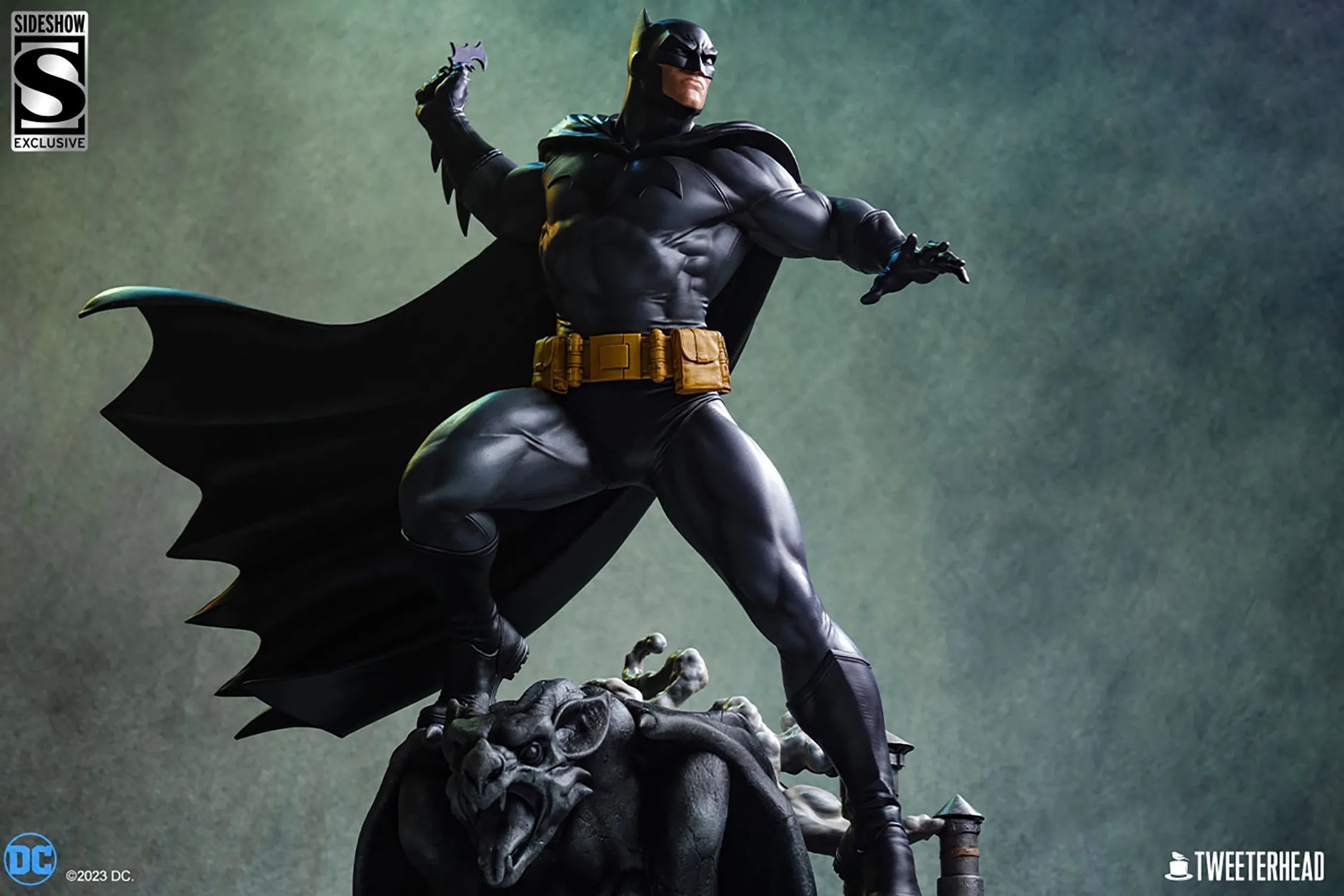 Esta estátua totalmente esculpida em poliresina apresenta o Batman em uma versão "Neo Clássica" de seu traje, sobre uma gárgula e um telhado inspirado em Gotham - pronto para a batalha! Refletido em uma pose de ação dinâmica e com o batarangue pronto, este Batman é esculpido e pintado com a maestria artística pela qual Tweeterhead é conhecido.