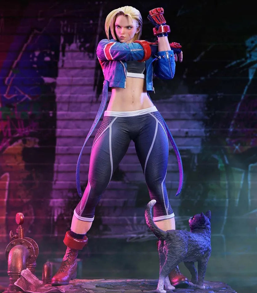 Cammy é meticulosamente esculpida em seu novo visual, apresentando seu novo traje civil, o icônico collant ficou para trás, agora ela veste uma jaqueta azul curta e brilhante com a Union Jack, a bandeira da Grã-Bretanha pintada nas costas, um top curto que deixa a barriga à mostra, e leggings de tecido elástico justas, ainda pronta para o combate se necessário, como representado com suas luvas carmesim. Como sempre, os escultores e pintores do Prime 1 Studios se esforçam ao máximo para texturizar e pintar cada centímetro perfeitamente. A base apresenta as ruas de paralelepípedos da Grã-Bretanha, com iluminação em LED – e não podemos esquecer do gato da Cammy, que sempre parece estar à espreita após cada vitória!