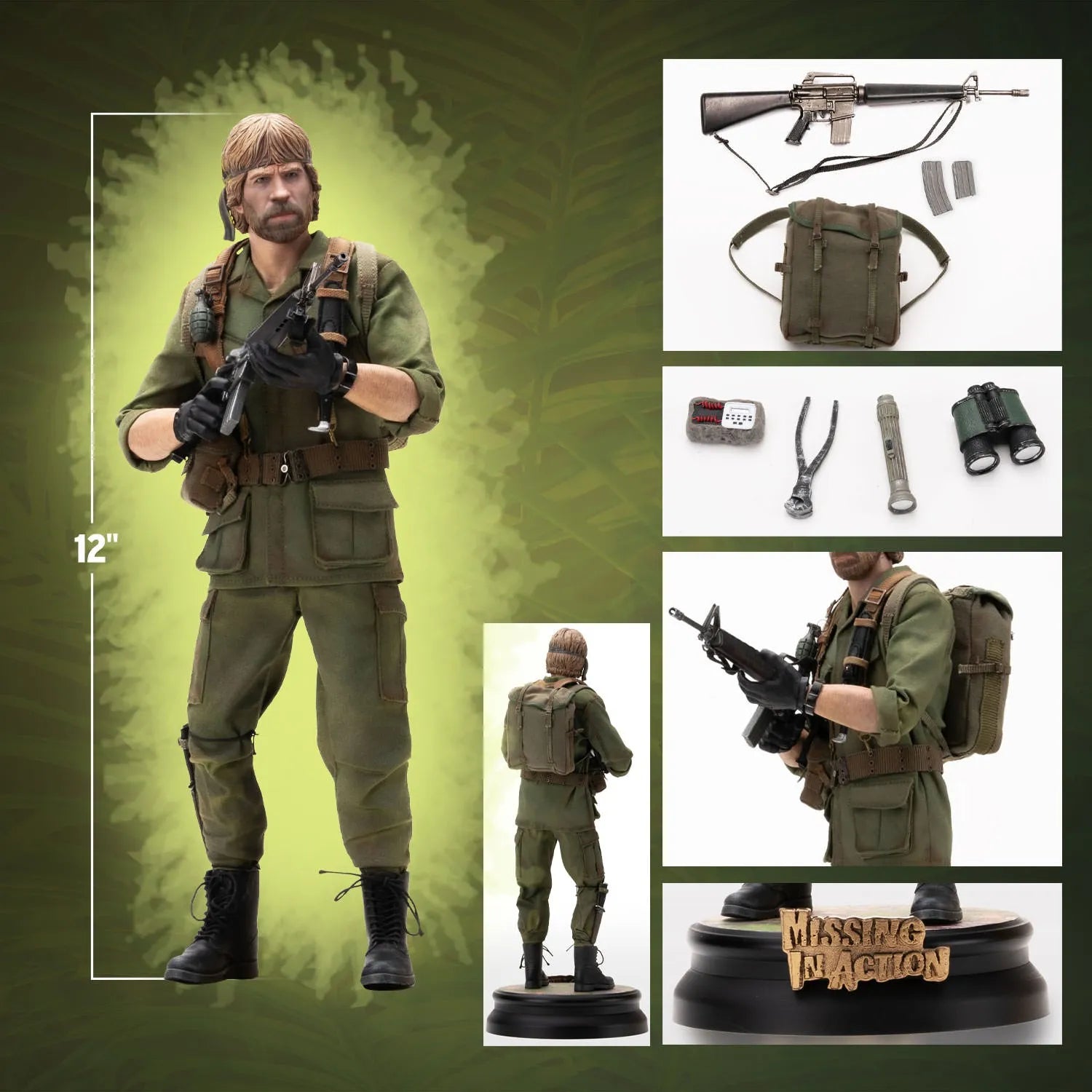 Prepare-se para entrar no mundo cheio de ação do Coronel James Braddock com nossa excepcional figura de ação em escala 1:6, apresentando o icônico Chuck Norris em seu papel inesquecível do filme de sucesso Desaparecido em Combate. Com impressionantes 30 centímetros de altura, esta figura de ação é uma verdadeira obra-prima, capturando cada detalhe da lendária interpretação de Norris. Nossa figura de ação exibe uma semelhança incrivelmente precisa de Chuck Norris como Coronel James Braddock. Desde seu comportamento destemido até sua expressão determinada, cada aspecto foi meticulosamente elaborado. Com mais de 28 pontos de articulação, o Coronel Braddock possui um corpo superarticulado. Seu traje icônico foi fielmente recriado e inclui uma gama completa de acessórios autênticos. Figura em Escala 1:6 do Coronel James Braddock não é apenas uma figura de ação, é uma homenagem a uma das figuras mais icônicas do cinema, Chuck Norris.