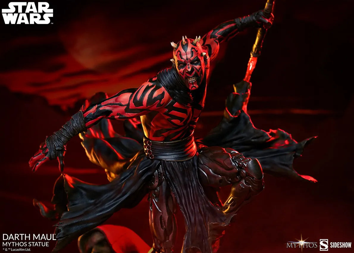 A Estátua Darth Maul Mythos de polystone apresenta um traje totalmente esculpido, composto por saias pretas desgastadas, cintos, faixas nos braços e um colar preto. Como resultado de seu fatídico duelo com Obi-Wan Kenobi, o Sith Dathomiriano agora possui pernas robóticas poderosas e altamente detalhadas que lhe permitem caçar suas presas Jedi com precisão animalesca. Darth Maul também é coberto por marcas tradicionais Zabrak, criando sua aparência característica em vermelho e preto. Esta estátua dinâmica também inclui dois retratos para os colecionadores escolherem; uma cabeça com expressão de raiva e chifres curtos, e uma cabeça em fúria com chifres mais longos.