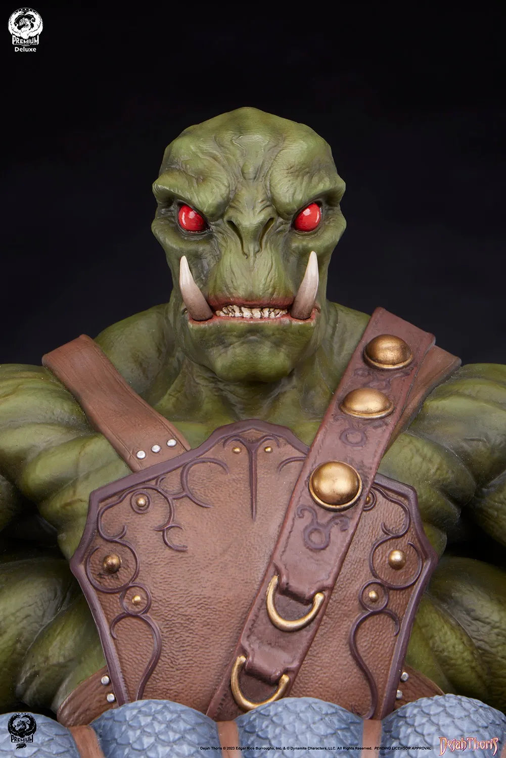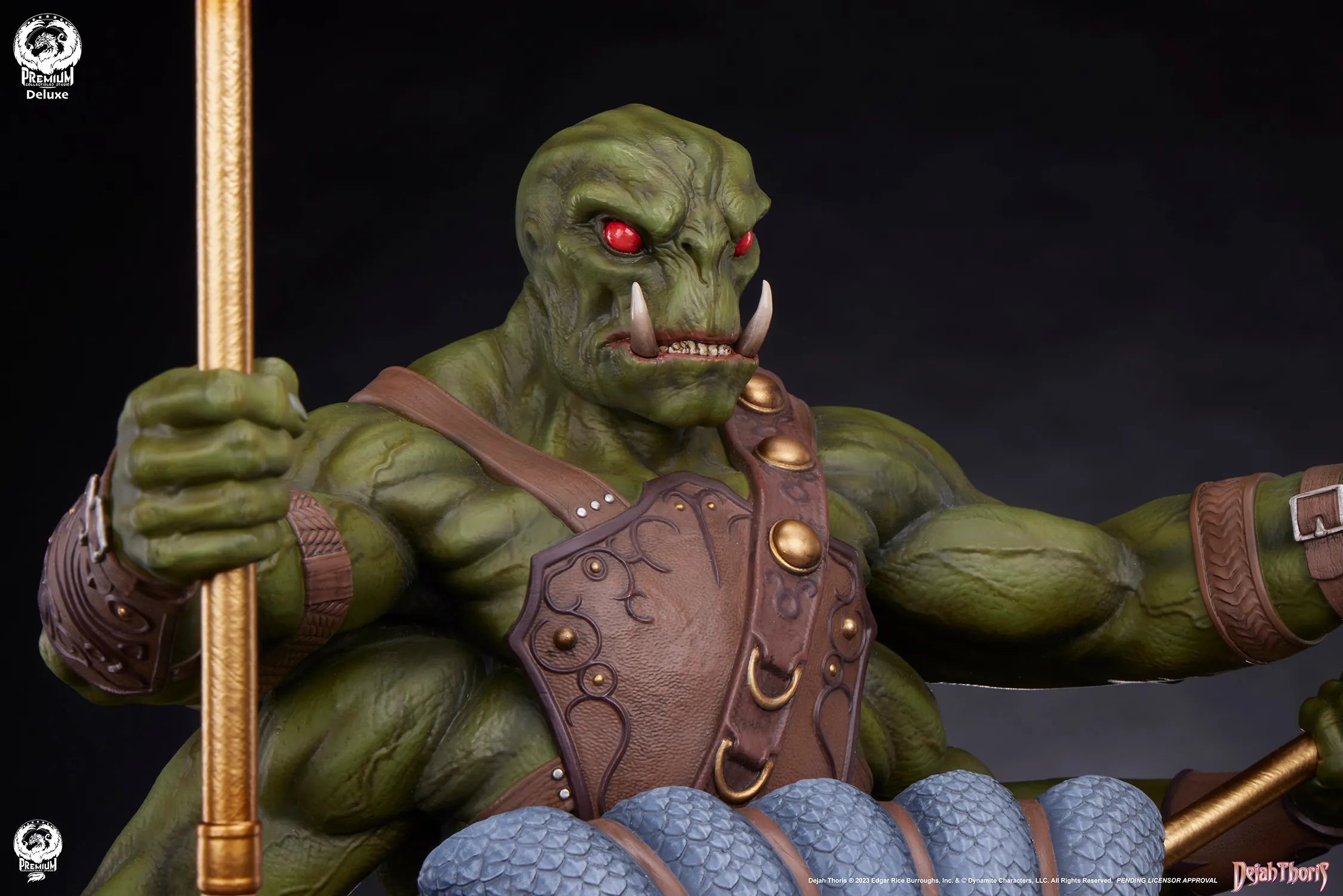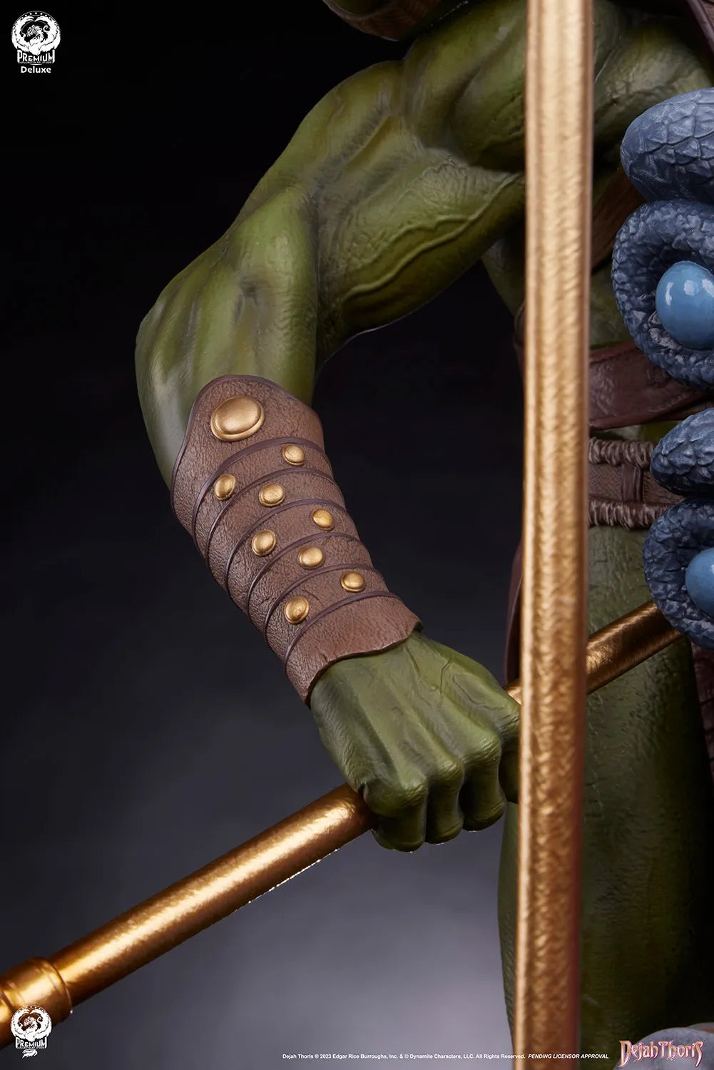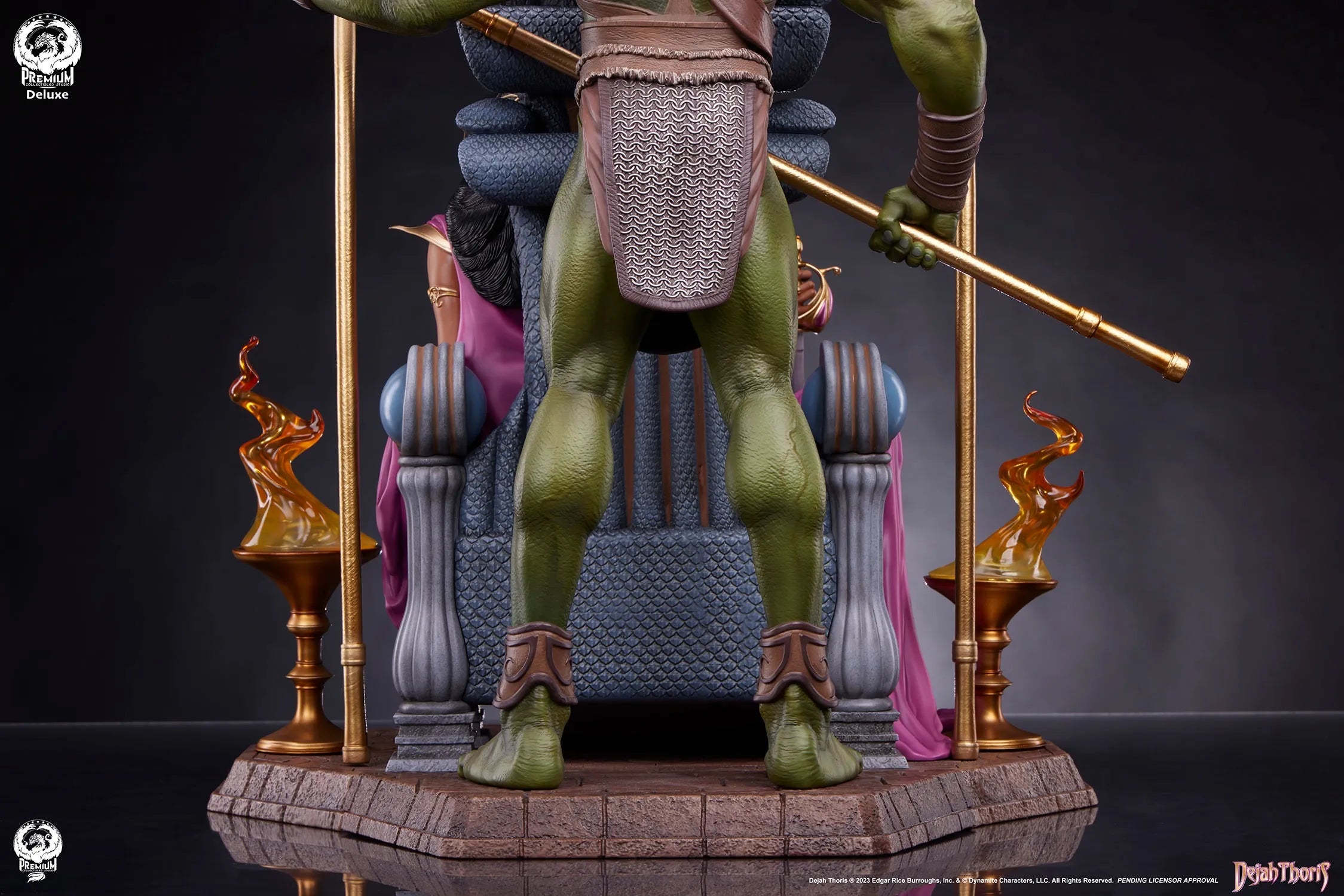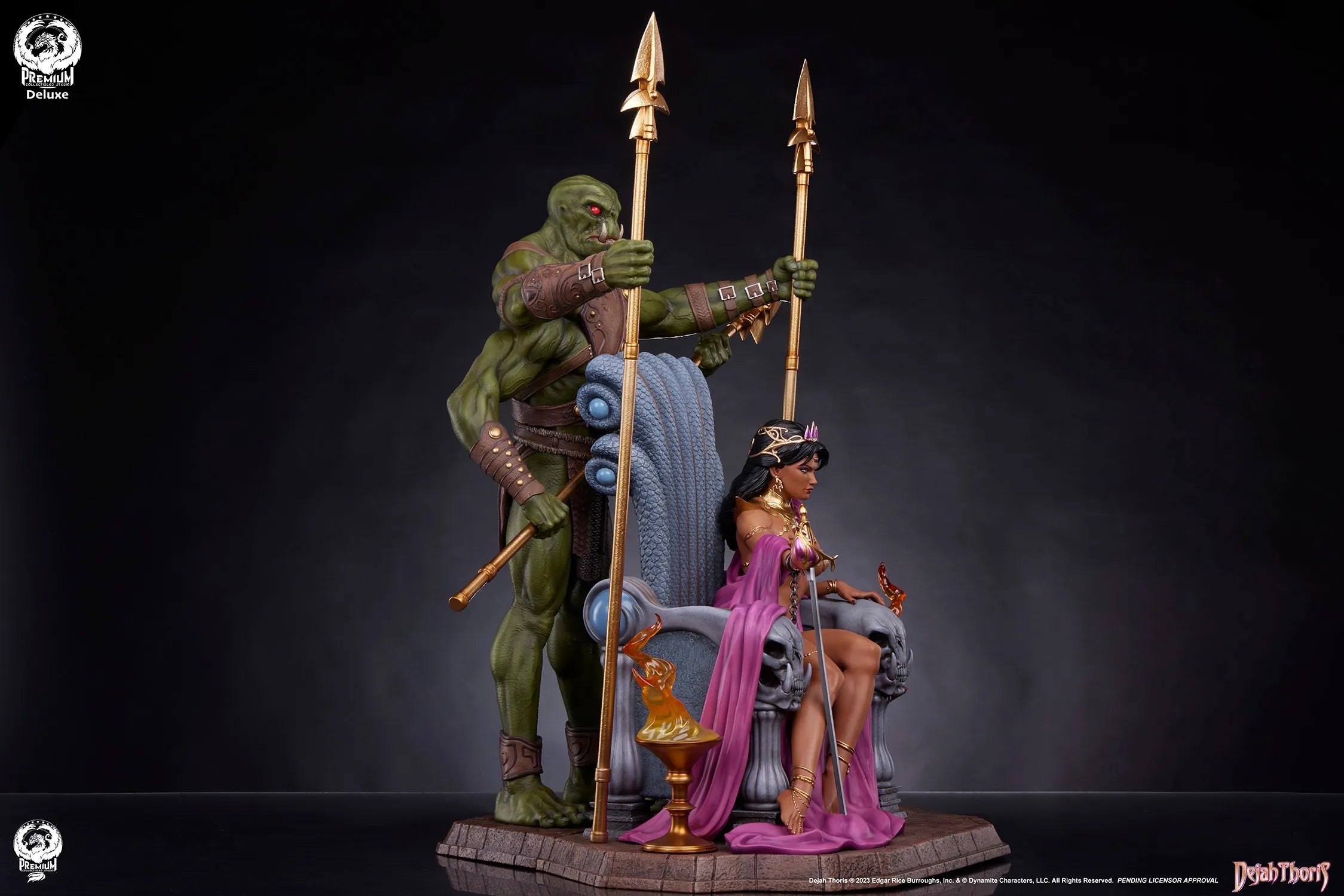 Inspirada na rara capa de quadrinhos de Dejah Thoris, a estátua em escala 1:4 de Dejah Thoris mede 43 cm de altura e 46 cm de largura enquanto a Princesa de Marte repousa no majestoso Trono de Barsoom, ladeada por dois braseiros dourados flamejantes de cada lado.