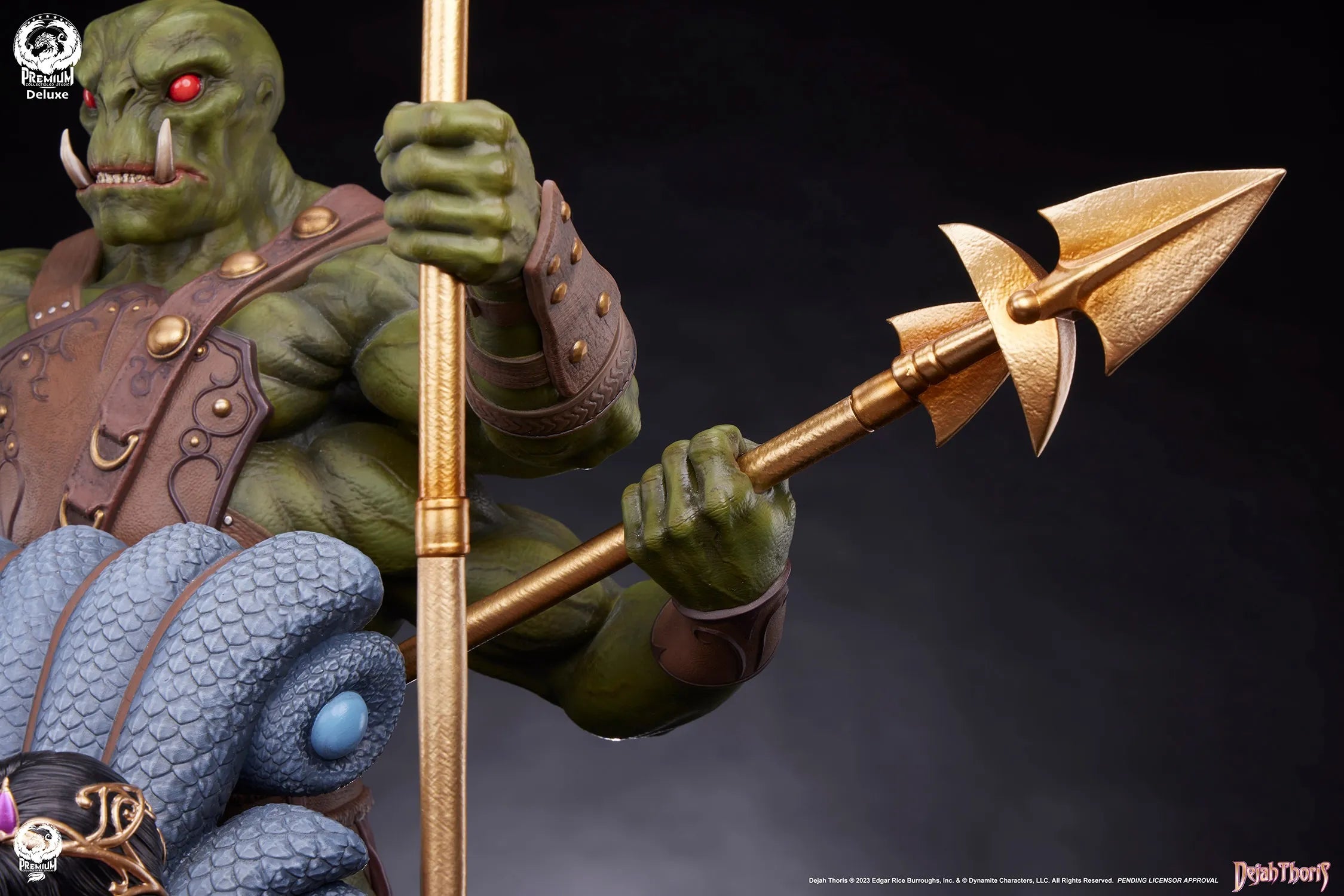 A edição Deluxe inclui um acessório Thark marciano verde totalmente esculpido segurando três lanças metálicas enquanto faz guarda atrás de Dejah Thoris.