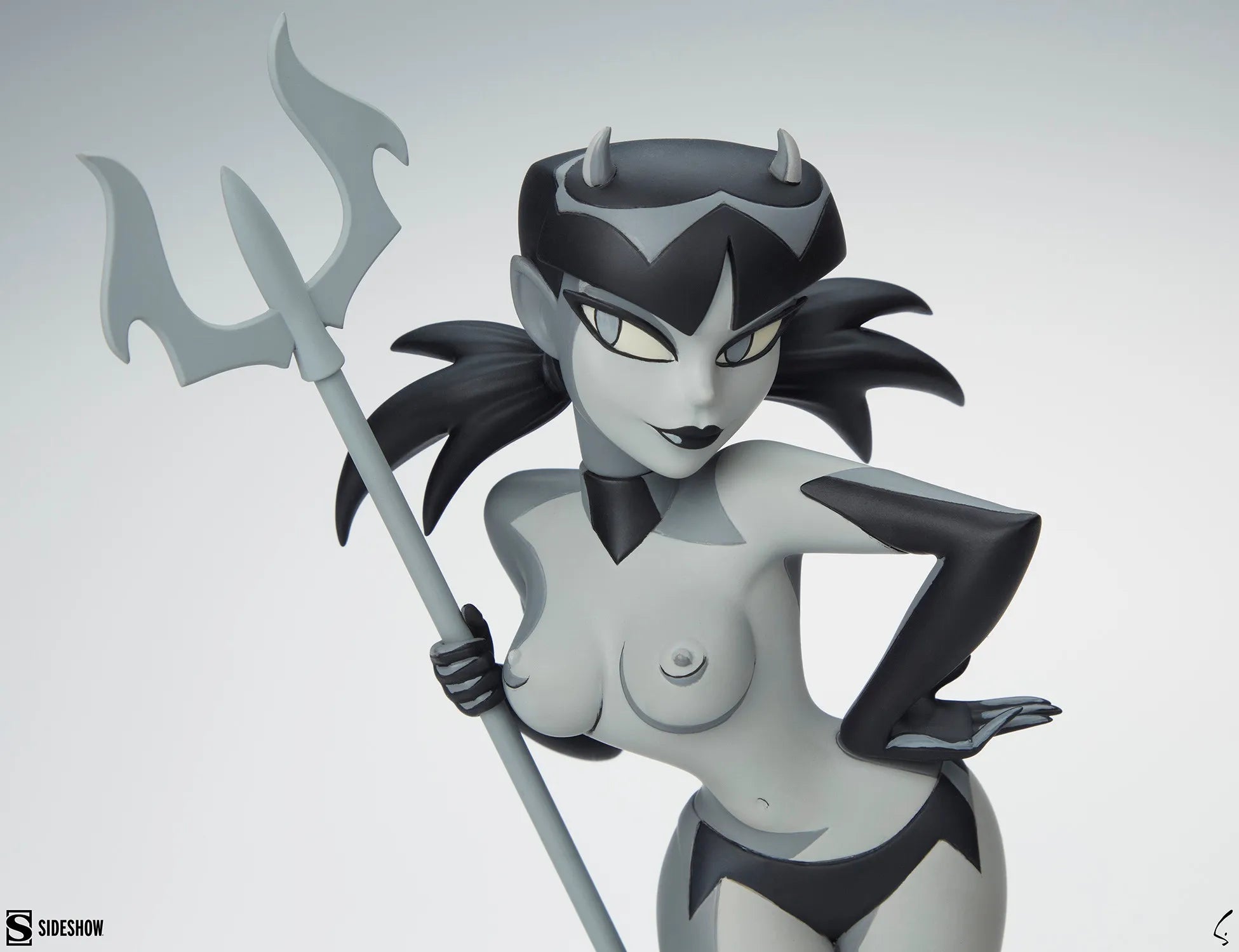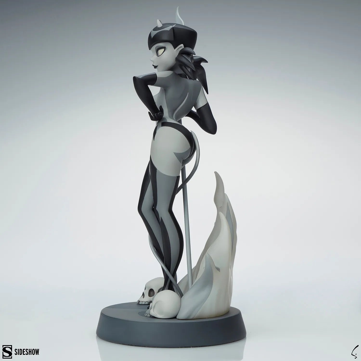 A Estátua Devil Girl (Variante Preto e Branco) tem 29,8 cm de altura, segurando um tridente enquanto posa confiantemente sobre uma base de inferno. Esta personagem travessa do artista Shane Glines é uma verdadeira diaba, com chifres, cauda e uma expressão provocante em seu rosto travesso. Chamas translúcidas sobem atrás da mulher diabólica enquanto um par de caveiras repousa aos seus pés, completando a cena.