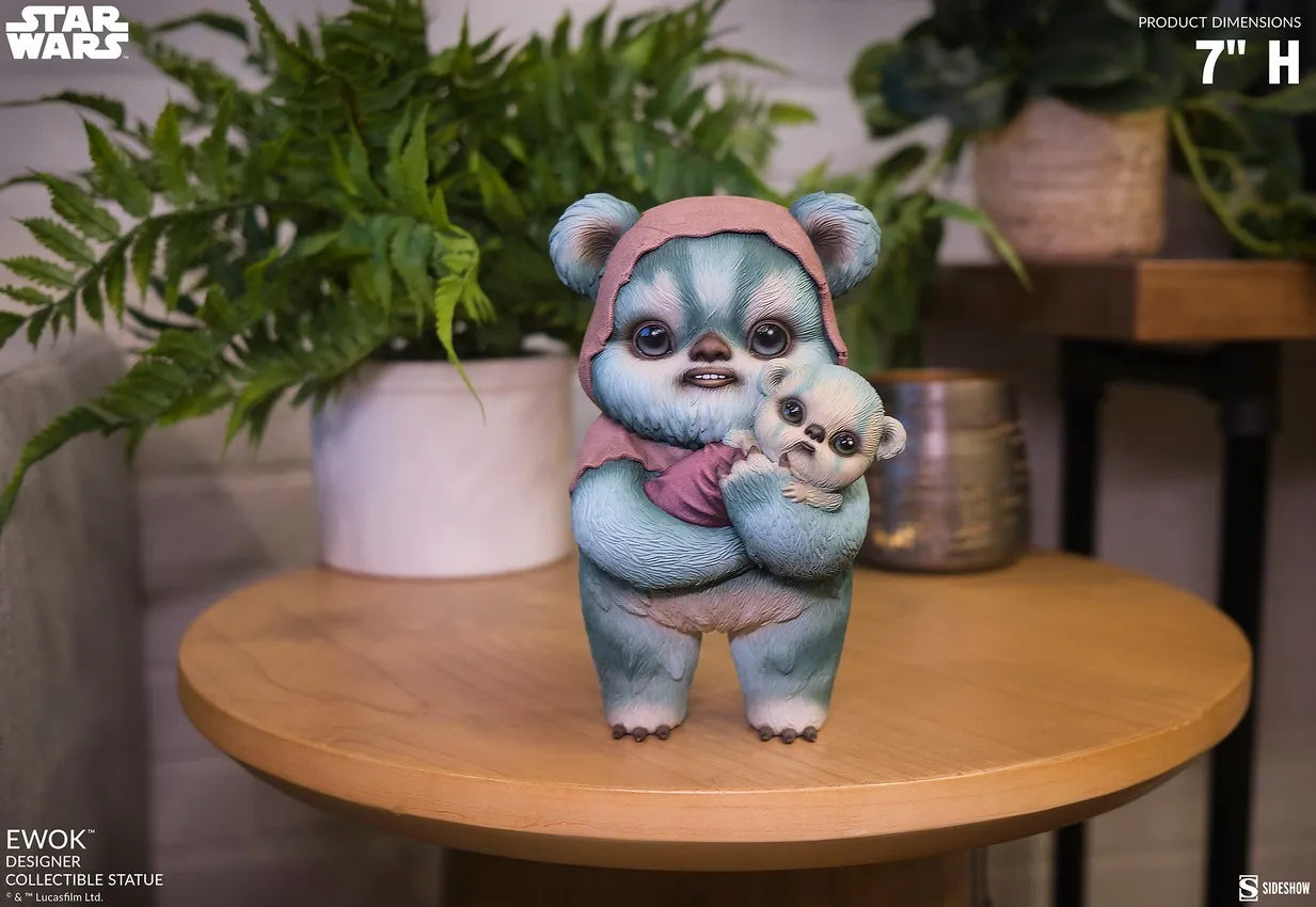 É preciso uma vila para criar um wokling! Medindo 18 cm de altura x 11,5 cm de largura x 10 cm de profundidade, este encantador colecionável de Star Wars™ captura perfeitamente as cores e texturas oníricas do estilo de pintura característico de Graves. Aqui, um Ewok adulto segura seu filhote enquanto a dupla de habitantes da lua florestal olha para fora com olhos grandes e brilhantes. Tons de pelagem azul suave, amarelo e verde contrastam com as cores terrosas de suas vestimentas de tecido, esculpidas com incrível atenção aos detalhes para dar à capa uma aparência desgastada e envelhecida. A Estátua Colecionável Designer Ewok também inclui uma base preta removível que se fixa aos pés. Da cabeça aos pés, esta impressionante estátua de Star Wars traz uma nova perspectiva aos icônicos e adorados Ewoks, que farão você se encantar com sua aparência adorável onde quer que os exiba.