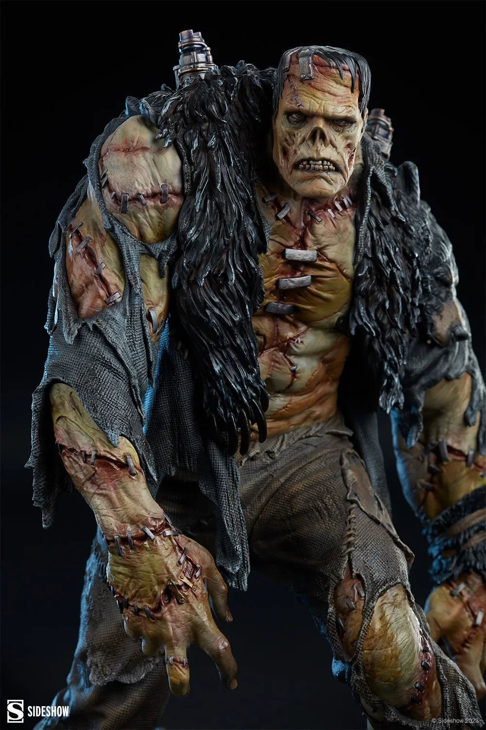 A Estátua do Monstro de Frankenstein mede 48 cm de altura x 33 cm de largura x 29 cm de profundidade e é totalmente esculpida para capturar todos os detalhes cadavéricos da figura imponente. Dois grandes eletrodos emergem de suas costas, que estão cobertas pela pele de um urso negro esfolado. Calças remendadas refletem a construção do monstro e grampos de prata mantêm sua carne reanimada unida em toda a superfície do corpo. Ele é pintado com uma mistura de amarelos apodrecidos e vermelhos irritados, enfatizando como a criação de Frankenstein caminha na linha entre a vida e a morte.
